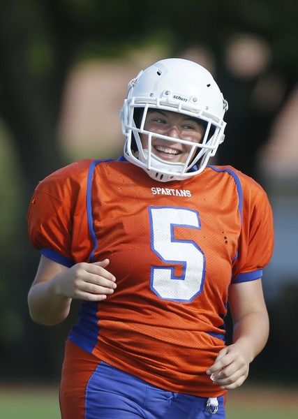 Thursday's intra-squad scrimmage at Hollywood Hills High was the first tackle football game experience for Neher, who has been a quarterback for the girls' flag football team the past two seasons. She has been working and training with the Spartans throughout their offseason program.