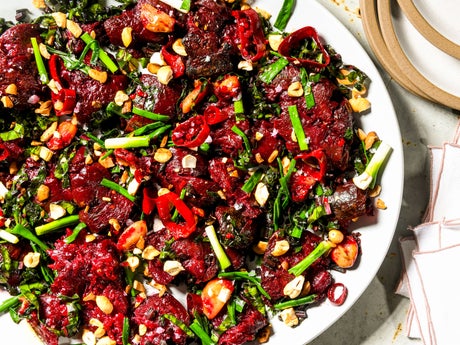 Gourdet calls for quickly wilted spring onions on top, but if you buy the beets with their greens on, as I did, throw them in, too. I wanted a little protein, so I tossed on some cashews for even more crunch.