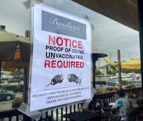 The sign was among the most extreme examples of the state of our culture wars. It is, by now, unsurprising that the pandemic and the COVID-19 vaccine have been weaponized strategically — polarization on anything and everything is the playbook — by the Trumpian acolytes that have contorted themselves to adhere to the former president’s base. But the fact that a restaurant would go to such lengths, to willingly harm their own business (the long con that this would in fact attract more patrons due to its attention-grabbing stance is doubtful), in order to play to this politics of antagonism that they have been fed still feels startling.