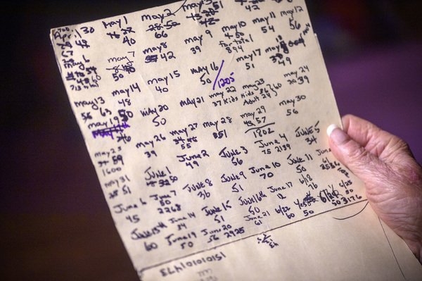 The masks are then handed back to Whitham who steams the pleats before hanging the masks on a donated antique peddler's cart outside. A handwritten ledger keeps track of the count and information about distribution times.