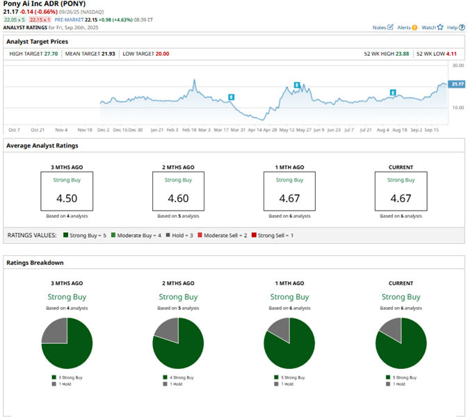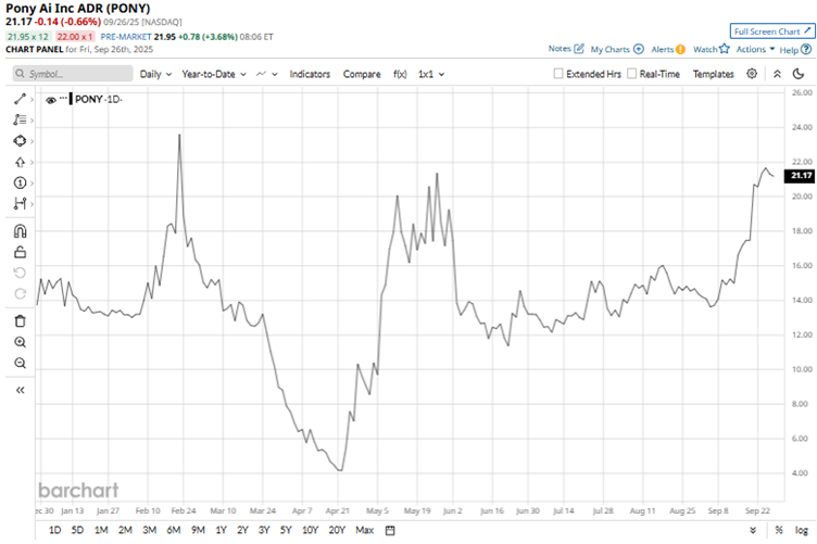 With robust investor enthusiasm and analyst sentiments, Pony AI’s stock has been surging this year. PONY stock is up 56% year-to-date (YTD), and it has increased by 50% over the past month. The stock reached a high of $24.92 on Oct. 2, but is now down 16% from that high.