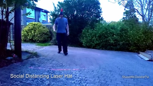 Fortunately, an engineer has created a totally normal, deeply stylish, easy solution you can build at home — a hat with an attached laser pointer that spins 360-degrees to create a six-foot, red circle around you.