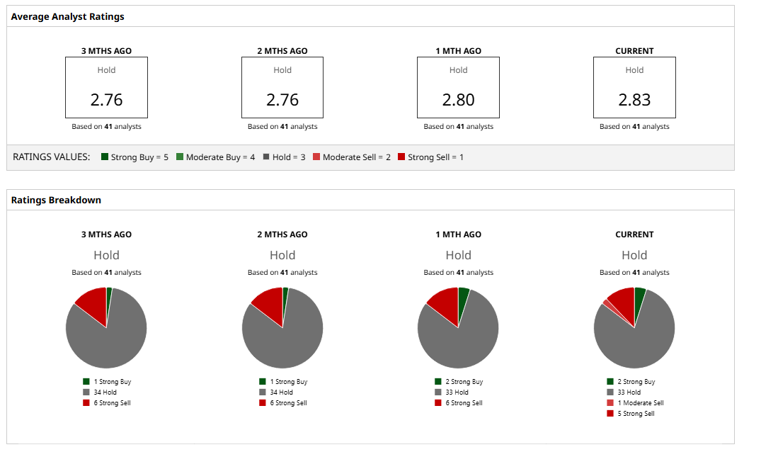 Overall, Wall Street rates Intel stock a “Hold.” Of the 41 analysts covering the stock, two rate it a “Strong Buy,” 33 rate it a “Hold,” one rates it as a “Moderate Sell,” and five suggest a “Strong Sell.” The stock has surpassed its average target price of $28.45. However, the Street-high estimate of $43 suggests the stock has upside potential of 13% over the next 12 months.