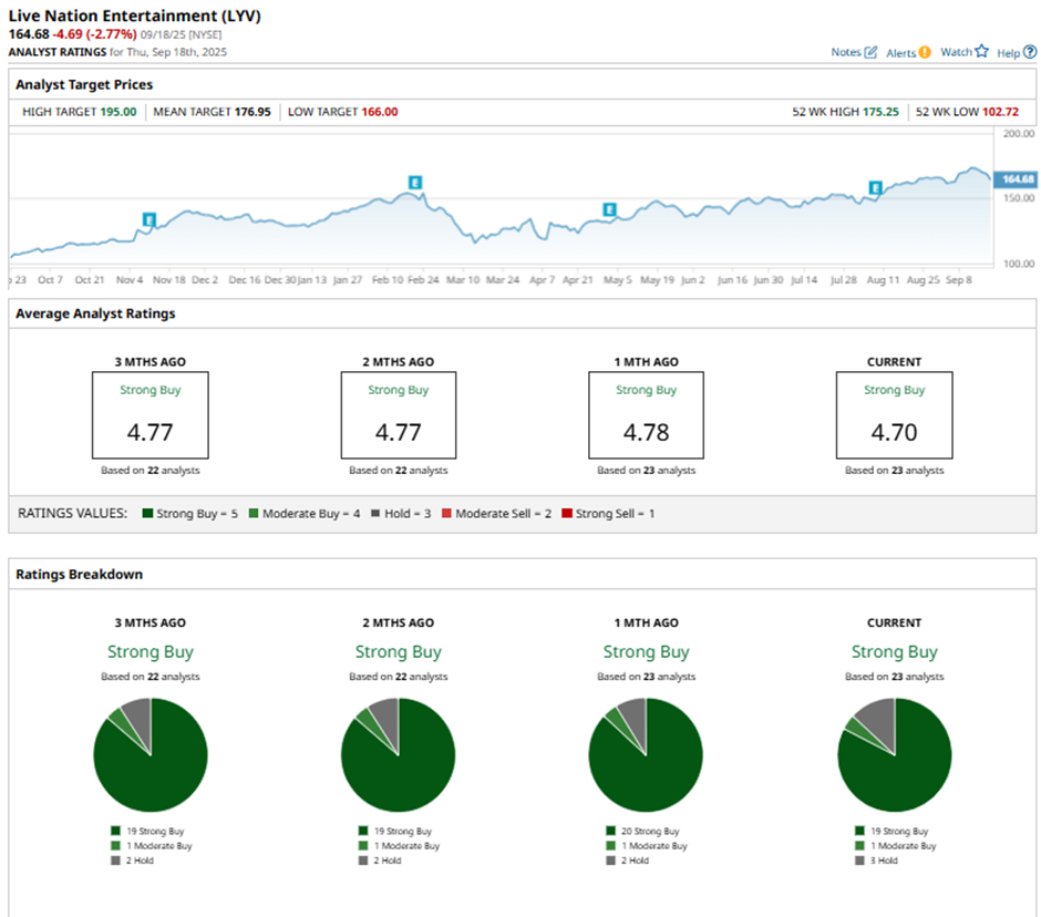 Even amid such regulatory scrutiny, Wall Street is keeping the faith in Live Nation. LYV stock carries an overall consensus “Strong Buy” rating, reflecting widespread optimism about its growth prospects. Out of 23 analysts covering LYV stock, 19 recommend a “Strong Buy,” one favors a “Moderate Buy,” and only three suggest “Hold.”