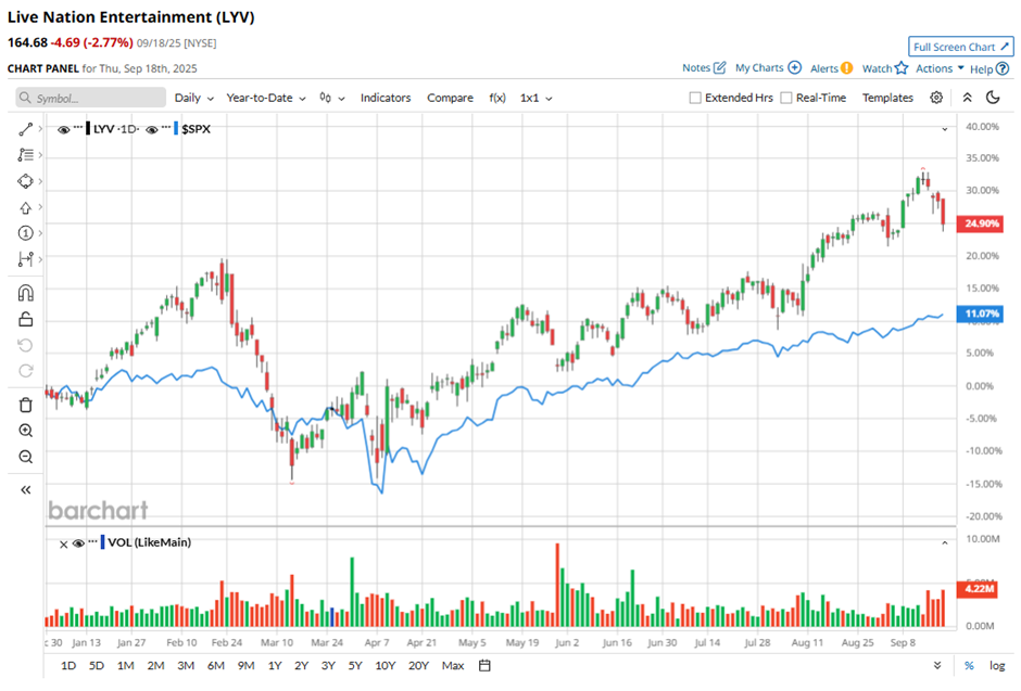 LYV stock recently hit a new peak of $175.25 on Sept. 15, but shares have since pulled back about 6% from that high amid fresh regulatory setbacks. On the brighter side, while the stock tanked almost 3% on Sept. 18 after the FTC crackdown announcement, LYV's longer-term performance remains quite impressive. LYV stock is up a notable 59% over the past year and 28% so far in 2025, outshining the broader S&P 500 Index’s ($SPX) 17% and 14% gains, respectively.