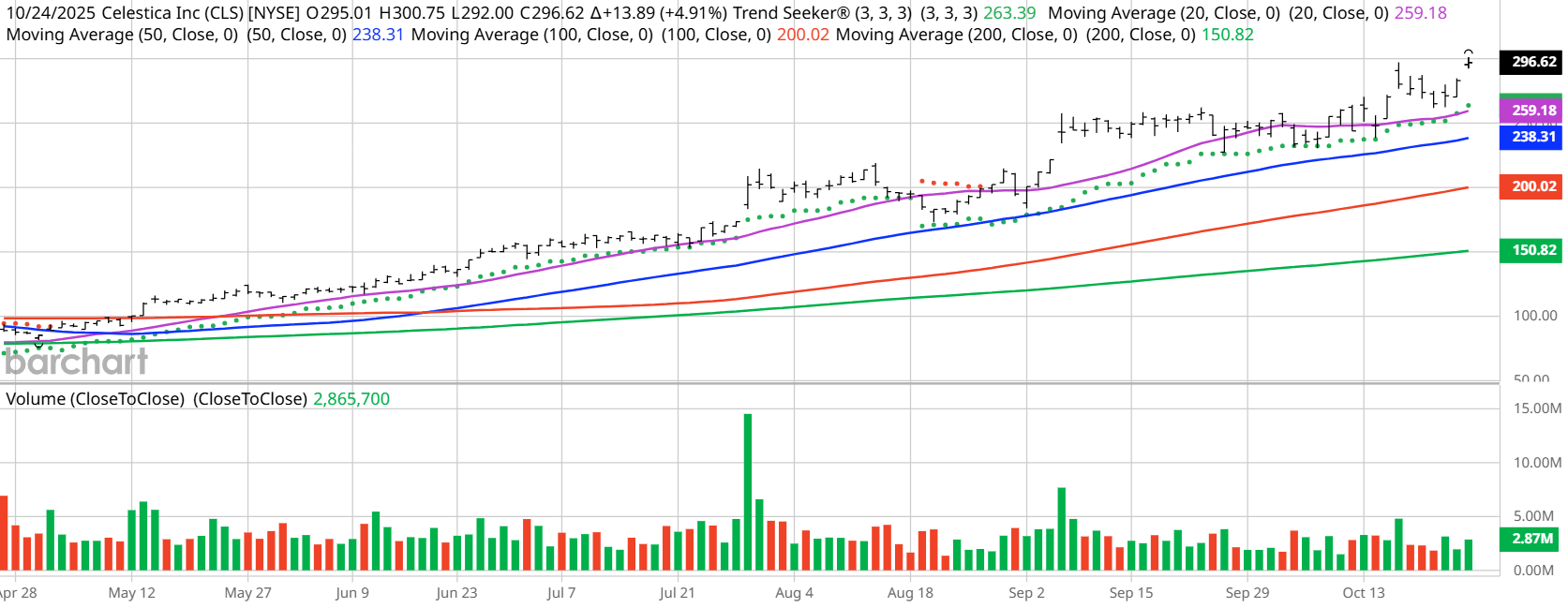 Celestica hit an all-time high of $314.29 in morning trading on Oct. 27.