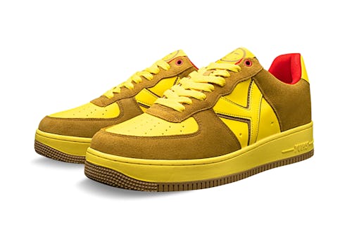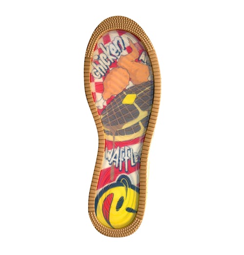 To channel the sweet and savory meal, Moton dressed YUMS’ signature sneaker in rugged brown suede overlays which contrast the yellow leather base. A yellow rubber midsole, brown outsole, and signature transparent sole art inlay help bring the theme home: Underneath the shoe, a graphic of fried chicken and waffles can be seen atop a checkered background.