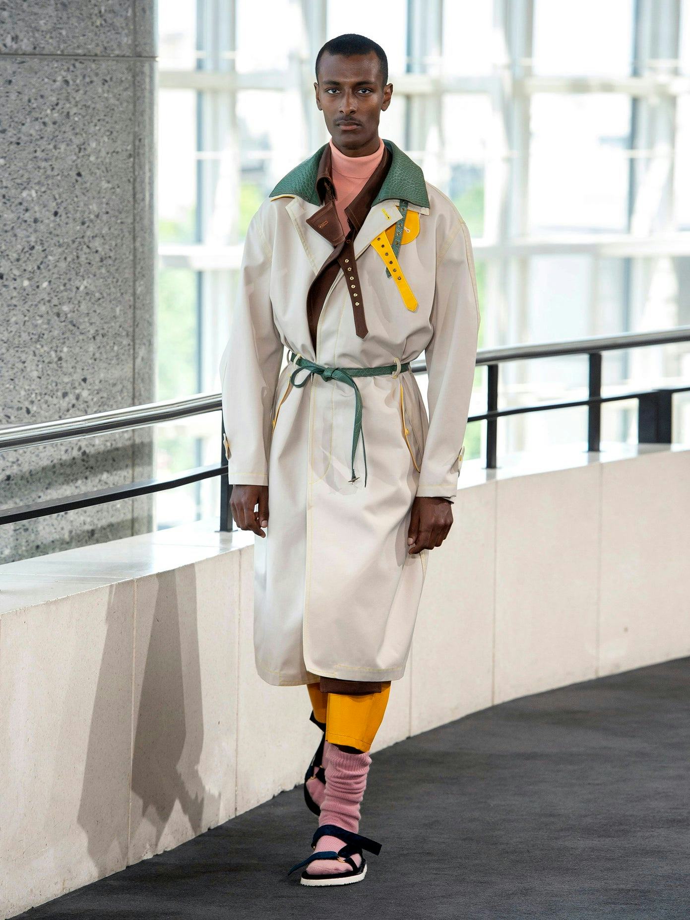 The Cruz gabardine belted trench coat, shown as part of the SS20 runway show, plays with color in a classic silhouette. Splashes of yellow give the traditional cut its modern character, including a belt to coordinate with the buttons and layered collar. The tailoring keeps it loose, making it easy to throw over anything as you protect yourself from the rain in style.