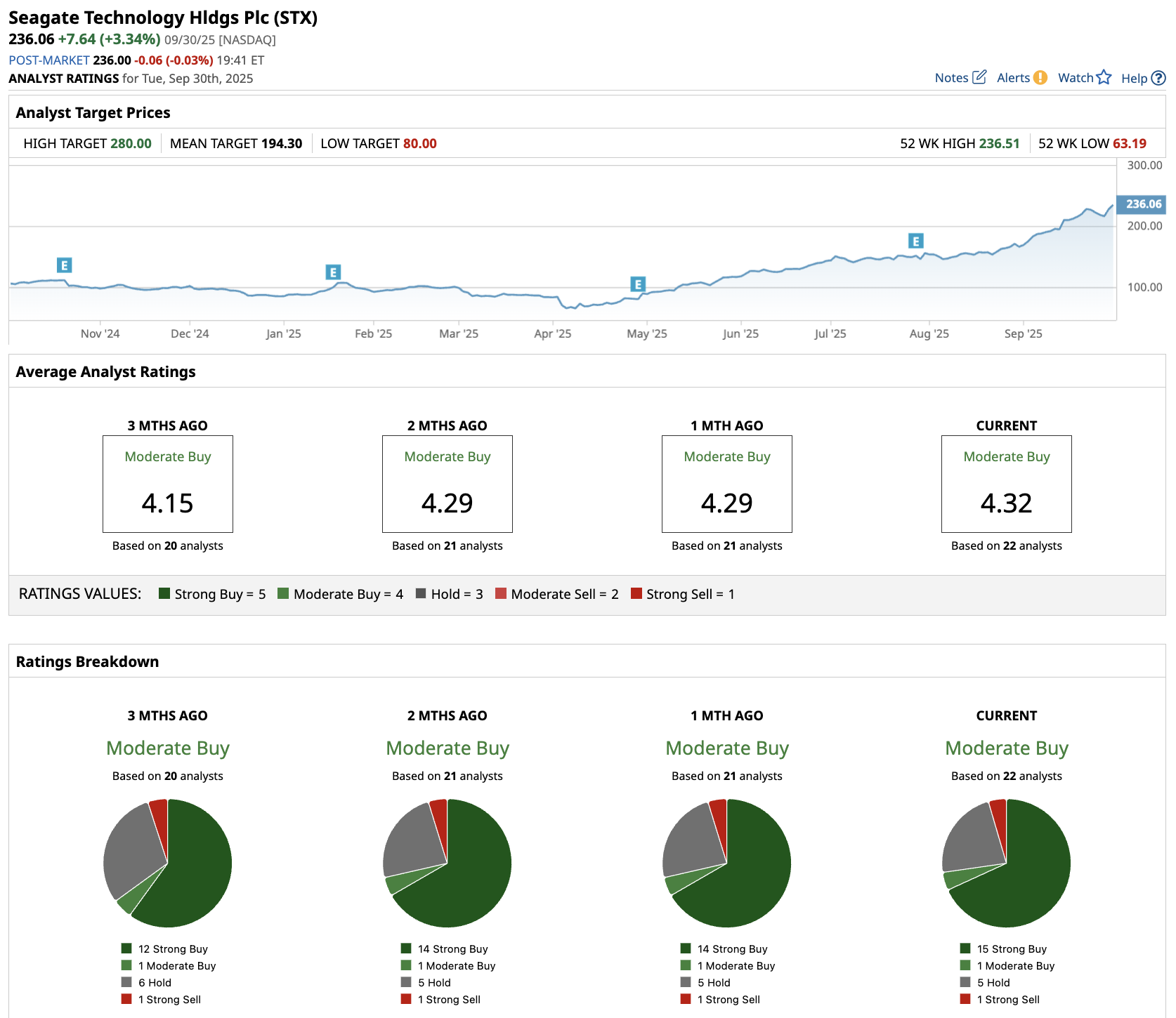 If STX stock is priced at 20 times forward earnings, it should trade around $300 in late 2027, indicating an upside potential of 27% from current levels. Out of the 22 analysts covering Seagate, 16 recommend “Strong Buy,” one recommends “Moderate Buy,” five recommend “Hold,” and one recommends “Strong Sell.”