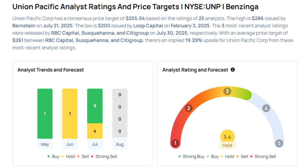 - Argus Research analyst Kristina Ruggeri downgraded Union Pacific Corporation (NYSE:UNP) from Buy to Hold. Union Pacific shares closed at $219.65 on Monday. See how other analysts view this stock.