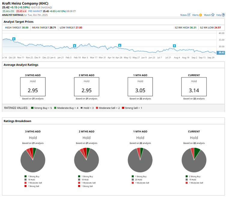 With shares of KHC stock sliding, consumer tastes shifting, competition heating up, and sales softening, a quick turnaround isn’t guaranteed. Wall Street is equally cautious, with most analysts taking a neutral stance. That said, investors who might be tempted to buy KHC stock now should proceed with caution and keep a close eye on how the company executes its next moves.