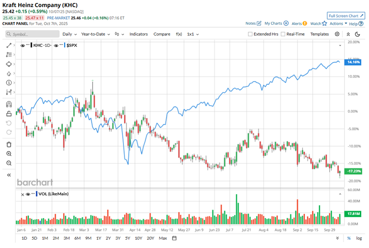 Over the past year, KHC stock has struggled, sliding 28%. Shares are also down roughly 17% year-to-date (YTD). For perspective, the broader S&P 500 Index ($SPX) has been cruising in the opposite direction, up about 13% both over the past year and YTD.