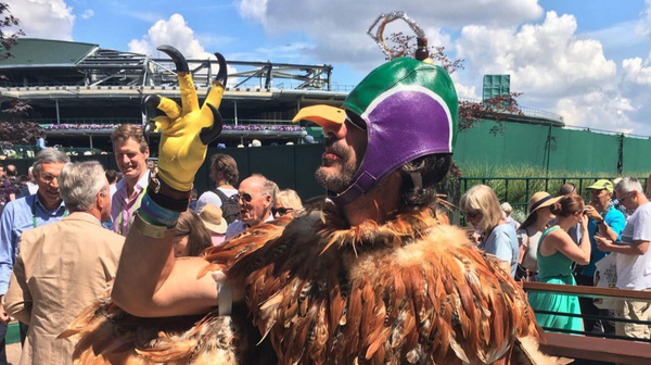 Fava, 41, an ardent tennis fan who lives in Los Angeles' Venice neighborhood, has worn a different elaborate Wimbledon-themed costume each of the past five tournaments. This year, he's dressed as Rufus the Hawk, the bird of prey used by the All England Lawn Tennis and Croquet Club to scare the pigeons off the 42-acre grounds.