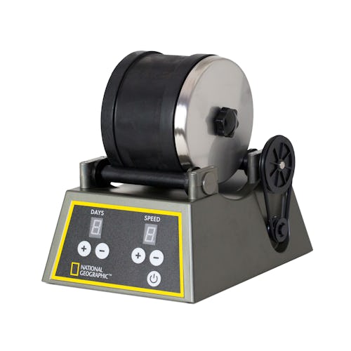 As for the National Geographic tumbler, it’s a workhorse. (The one we have is meant for professionals, but there’s a hobbyist version as well; both come with a variety of colorful rocks.) You put your rocks in the barrel with some grit (it’s included, but you’ll ultimately have to buy more) and some water. Then let the thing spin round and round and round.