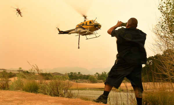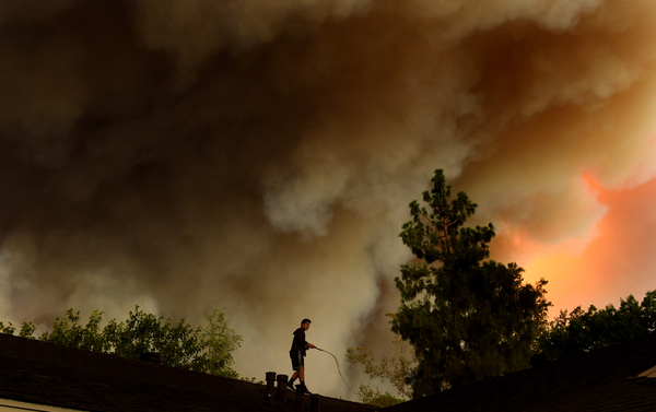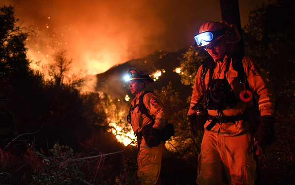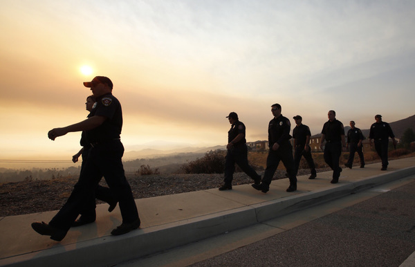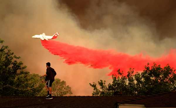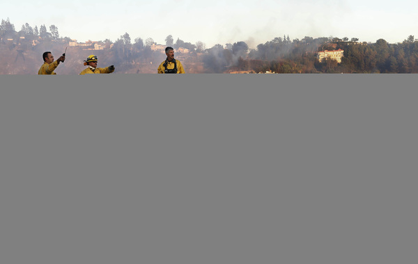 Authorities worry that wind gusts will push the fire south, toward billions of dollars' worth of property. Because of this, crews from the California Department of Forestry and Fire Protection have worked alongside firefighters from 10 other Western states to scrape containment lines that would serve as a fire break before winds shift Friday night. Streaks of red fire retardant dropped by aircraft or sprayed by tanker trucks line the hillsides as well.