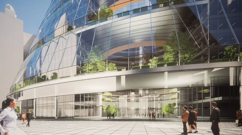 A rendering of Reschke’s plan, which was unveiled in December, includes a replacement curtain wall to fix the blaring sunshine and slash energy costs by half. The building’s annual operating expenses are about $17 million, largely due to the building’s glass envelope. Reschke last year said renovations would begin this year and would take about two years from start to finish, with a budget of $280 million.