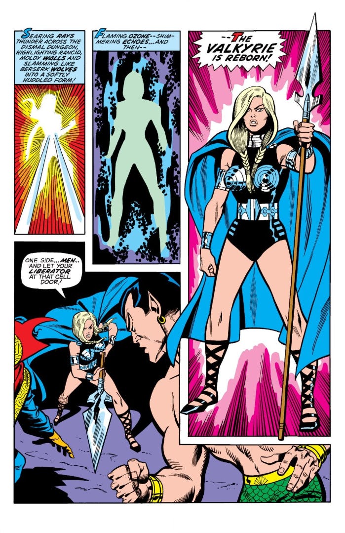 Valkyrie wore both a plain black leather outfit and her white and gold Valkyrie armor (also inspired by the comics; see “Vengeance! Cries the Valkyrie” from The Defenders #109) in 2017’s Thor: Ragnarok, and now her black and silver armor will appear in Love and Thunder. Thanos went out collecting the Infinity Stones, but Valkyrie is out here collecting her fits.