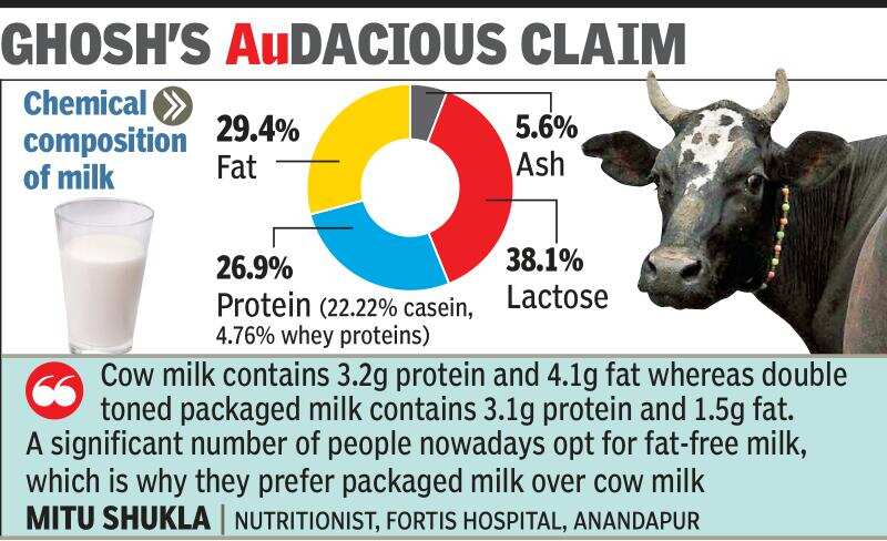 KOLKATA: Bengal BJP chief Dilip Ghosh rekindled the gold-in-cow’s-milk debate on Friday, saying that people in and around Kolkata — used to having “packet milk” — could not possibly find gold in the product.