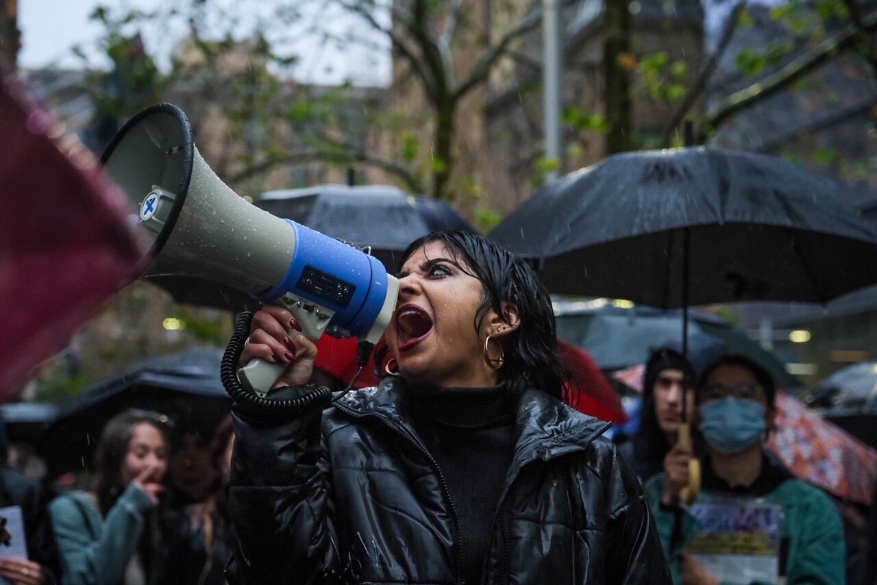 In Sydney, protesters braved the wet weather to meet at Town Square and hear from speakers including NSW Greens MP Jenny Leong.