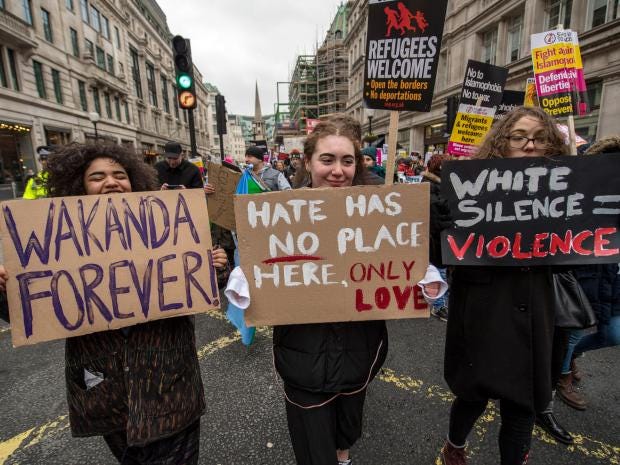Large crowds gathered in London to march through the UK capital before listening to key speakers including Shadow Home Secretary Diane Abbott, the President of the Trade Union Congress (TUC) Sally Hunt and singer songwriter Ray Blk.