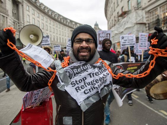 Anti-racism demonstrators were seen chanting with chains around their necks to symbolise refugees being treated like criminals. Some let off flares.