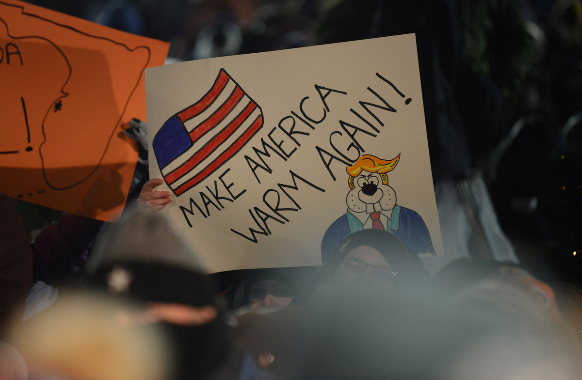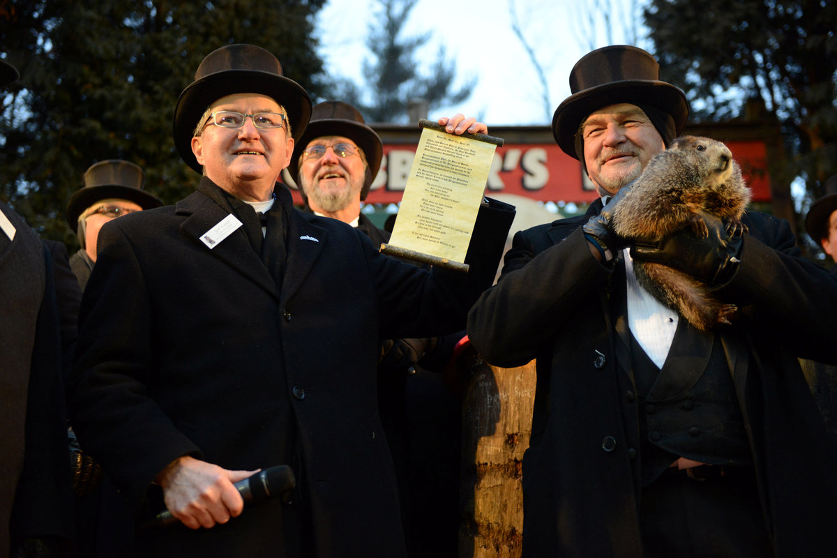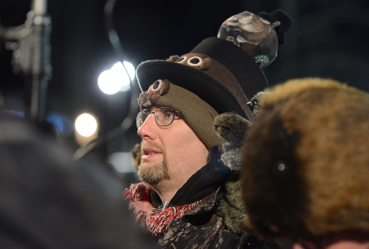 Ryan Teti, of Youngstown, Ohio, wears a groundhog hat while watching the festivities at Gobbler's Knob on the 132nd Groundhog Day in Punxsutawney, Pennsylvania, U.S. February 2, 2018. REUTERS/Alan FreedAlex Domingo of Indianapolis, Indiana, watches early morning entertainment at Gobbler's Knob on the 132nd Groundhog Day in Punxsutawney, Pennsylvania, U.S. February 2, 2018. REUTERS/Alan FreedGroundhog Club Inner Circle member Jeff Lundy holds a scroll revealing Punxsutawney Phil's forecast for six more weeks of winter at Gobbler's Knob on the 132nd Groundhog Day in Punxsutawney, Pennsylvania, U.S. February 2, 2018. REUTERS/Alan FreedOne of Punxsutawney Phil's followers holds a sign encouraging warmer weather at Gobbler's Knob on the 132nd Groundhog Day in Punxsutawney, Pennsylvania, U.S. February 2, 2018. REUTERS/Alan FreedGroundhog Club Inner Circle member Jeff Lundy reads Phil's prediction of six more weeks of winter at Gobbler's Knob on the 132nd Groundhog Day in Punxsutawney, Pennsylvania, U.S. February 2, 2018. REUTERS/Alan FreedGroundhog Club Inner Circle members Dave Gigliotti and Dan McGinnis welcome a large crowd at Gobbler's Knob on the 132nd Groundhog Day in Punxsutawney, Pennsylvania, U.S. February 2, 2018. REUTERS/Alan Freed