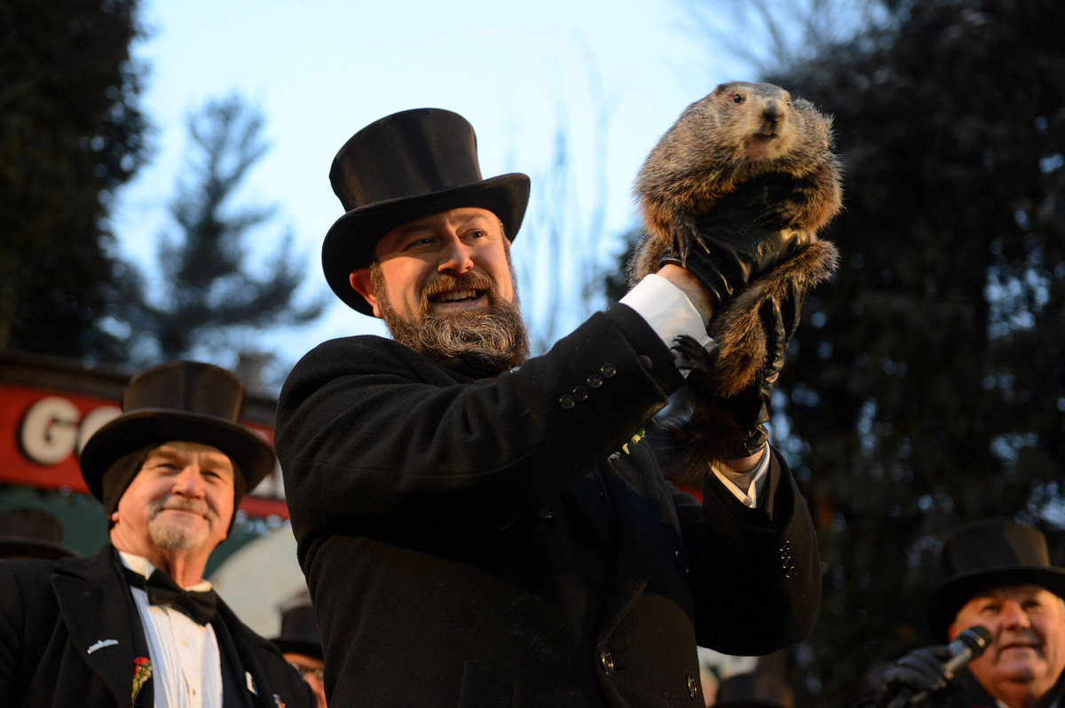 Groundhog co-handler A.J. Derume holds Punxsutawney Phil at Gobbler's Knob on the 132nd Groundhog Day in Punxsutawney, Pennsylvania, U.S. February 2, 2018. REUTERS/Alan Freed