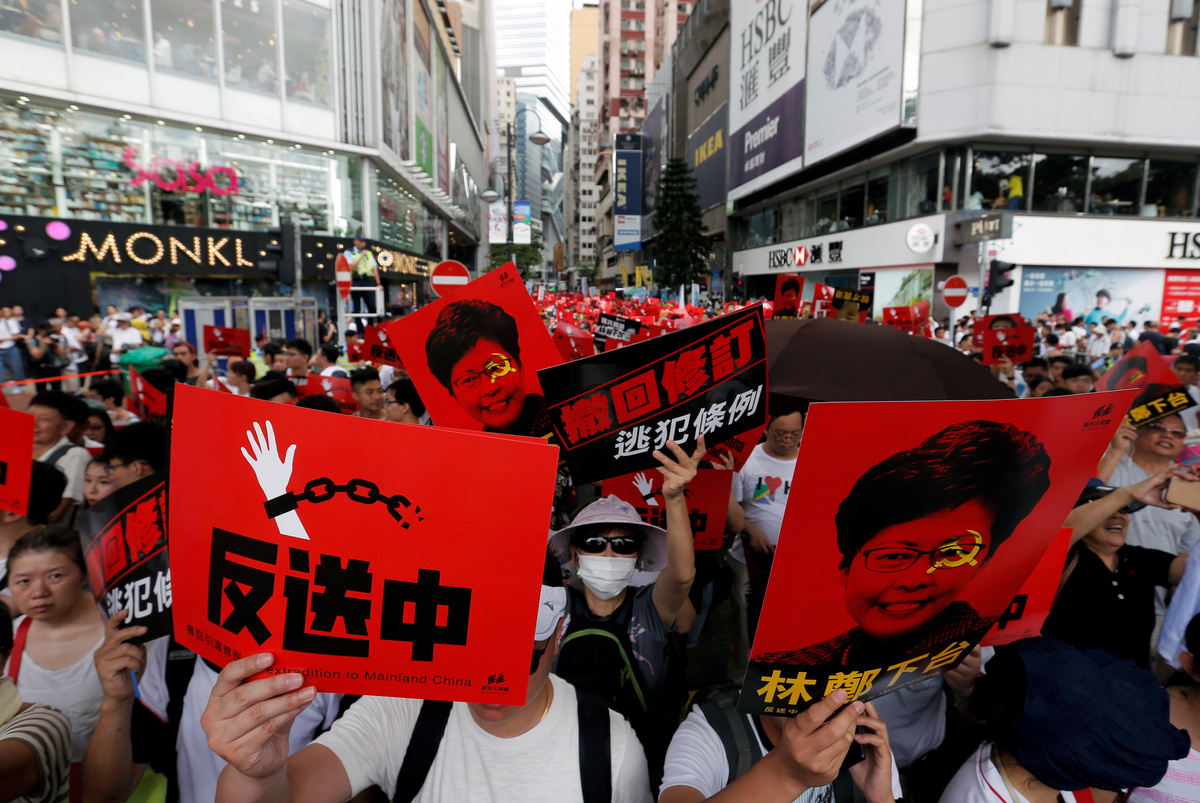Chants of "no China extradition, no evil law" echoed through the high-rise city streets, while other marchers called for Hong Kong's Chief Executive Carrie Lam to step down. One protester held a sign reading "Carry off Carrie".