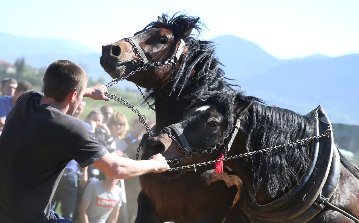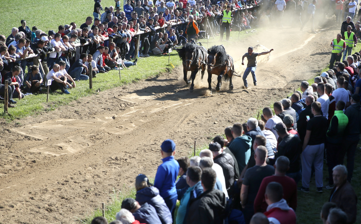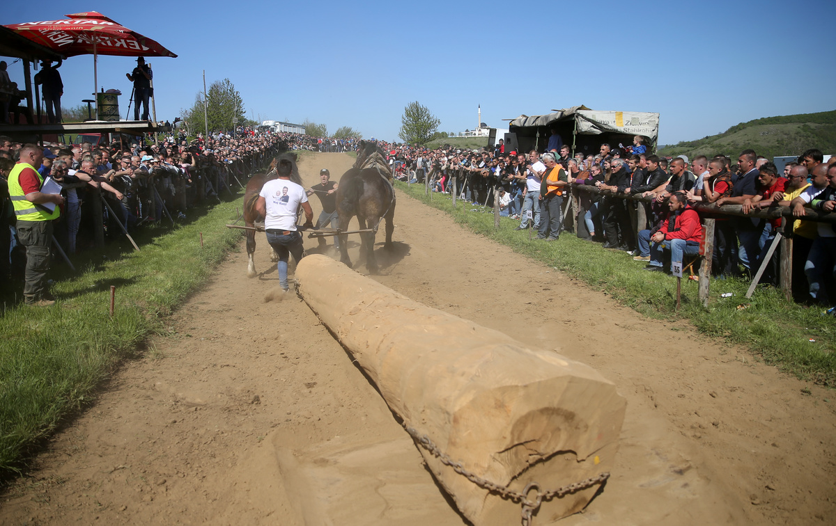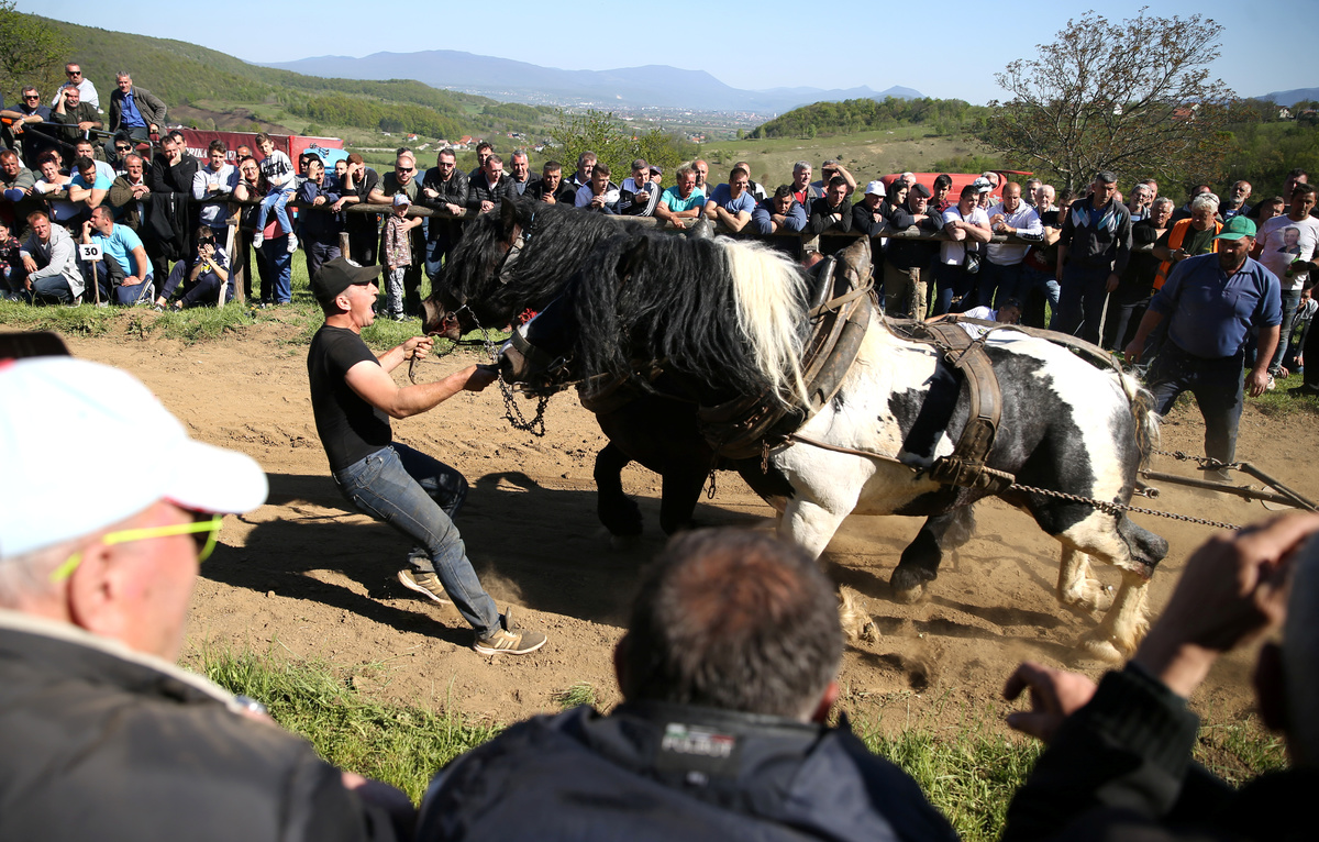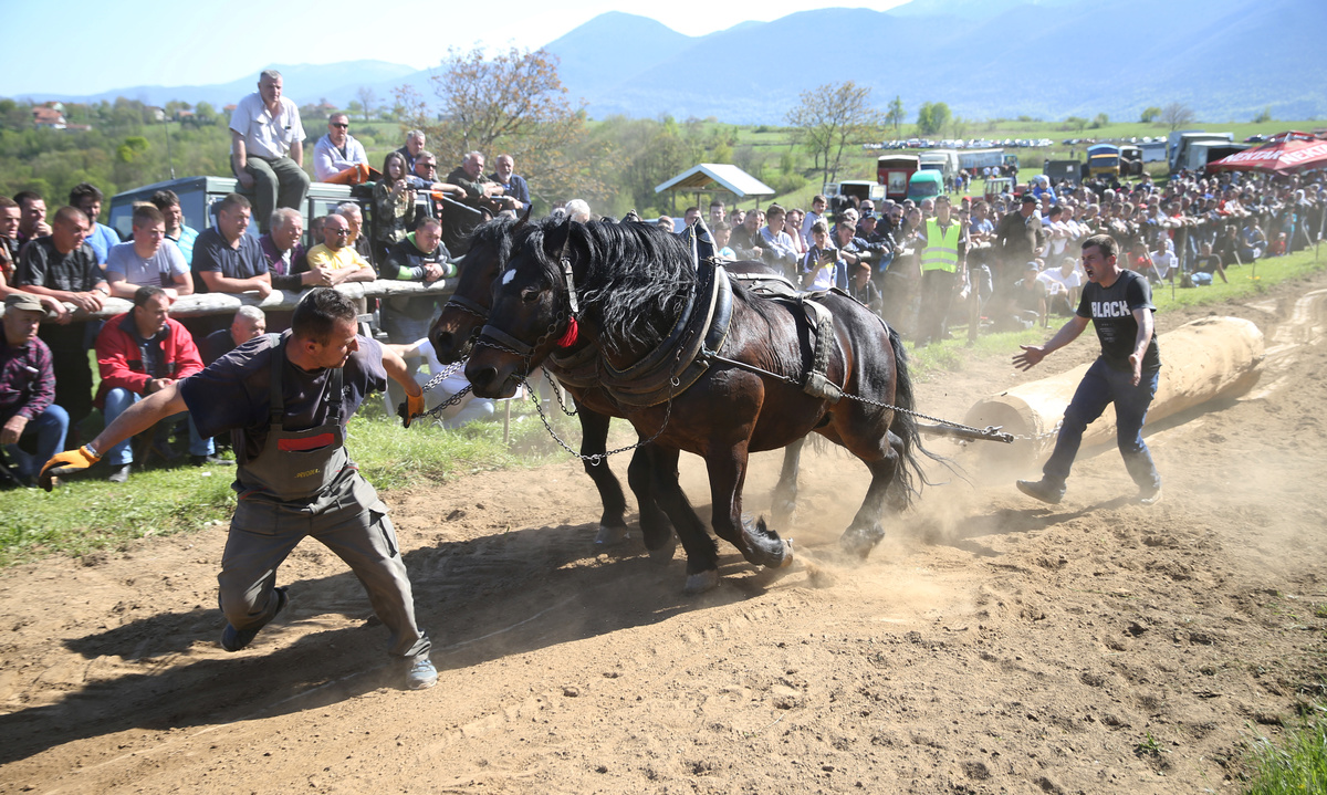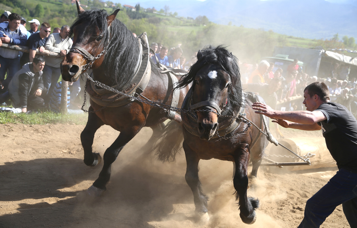 The twice-yearly Straparijada event in which pairs of horses compete in strength hauling heavy logs along a 100-metre track draws fans from across the Balkan country and neighboring Serbia and Croatia.