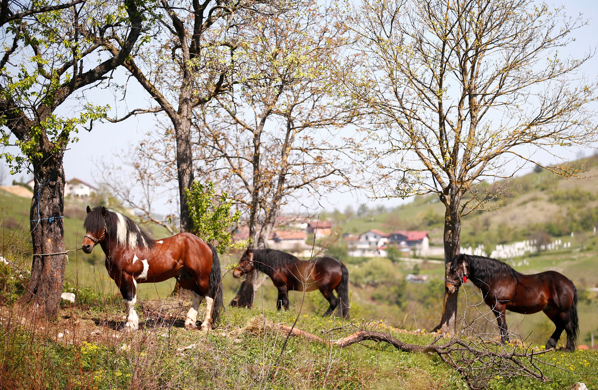 The horses compete in three different categories depending on the weight they haul, with the heaviest logs weighing about two tonnes. Folk singers entertain the mainly male visitors while they enjoy roast lamb on a stick, a Bosnian specialty.