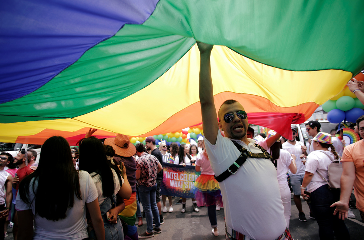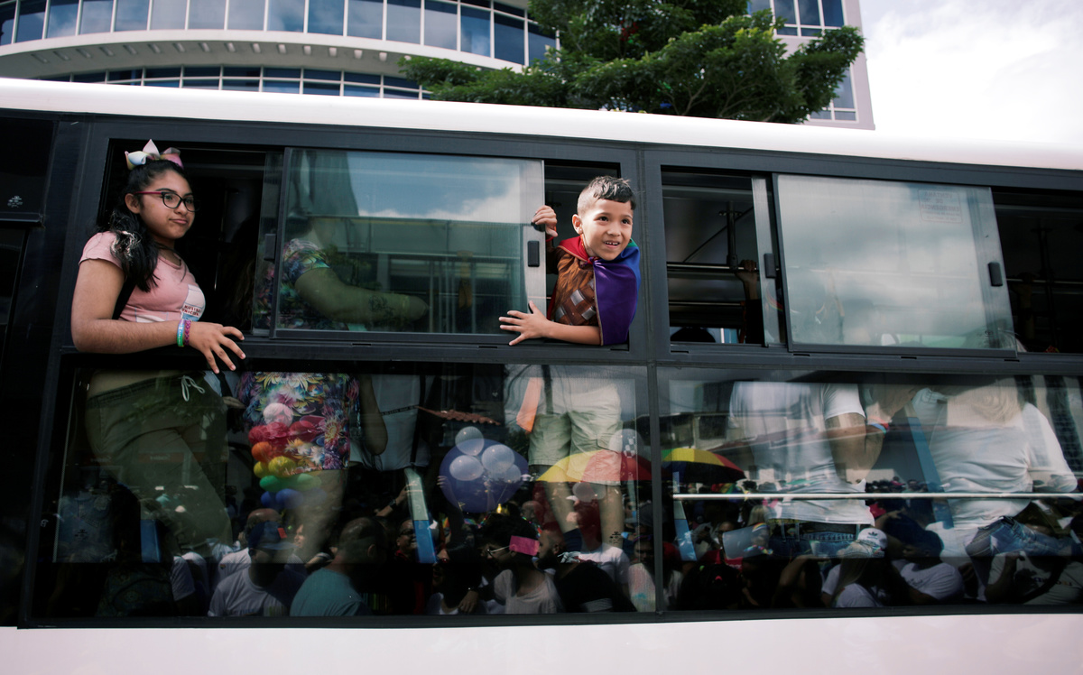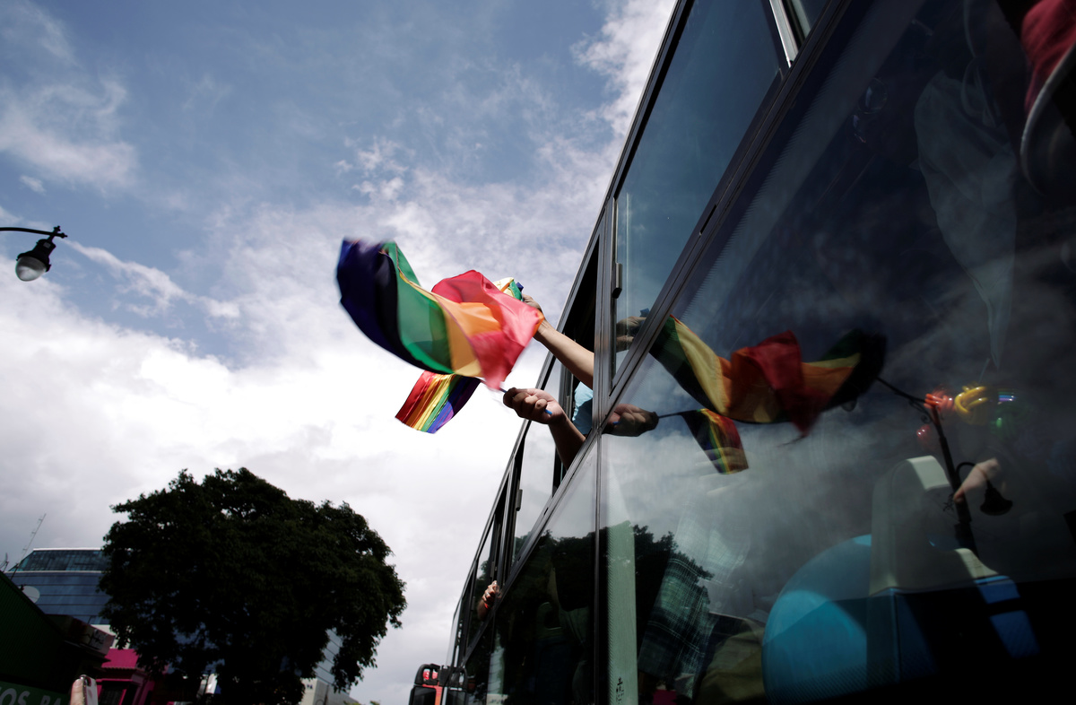 Revellers wave a rainbow flag from a bus during the annual Gay Pride parade along Central Avenue, in San Jose, Costa Rica June 23, 2019. REUTERS/Juan Carlos UlateA man wearing a mask with the colors of the rainbow flag takes part in the annual Gay Pride parade along a Central Avenue, in San Jose, Costa Rica June 23, 2019. REUTERS/Juan Carlos UlateA reveller participates in the Gay Pride parade along a Central Avenue, in San Jose, Costa Rica June 23, 2019. REUTERS/Juan Carlos UlatePeople take part in the annual Gay Pride parade along a Central Avenue, in San Jose, Costa Rica June 23, 2019. REUTERS/Juan Carlos UlateRevellers take part in the annual Gay Pride parade along a Central Avenue, in San Jose, Costa Rica June 23, 2019. REUTERS/Juan Carlos UlateA rainbow flag waves at an apartment building during the Gay Pride parade along a Central Avenue, in San Jose, Costa Rica June 23, 2019. REUTERS/Juan Carlos UlatePeople take part in the annual Gay Pride parade along the Central Avenue, in San Jose, Costa Rica June 23, 2019. REUTERS/Juan Carlos UlateA gay couple kisses as they take part in the annual Gay Pride parade along Central Avenue, in San Jose, Costa Rica June 23, 2019. REUTERS/Juan Carlos Ulate