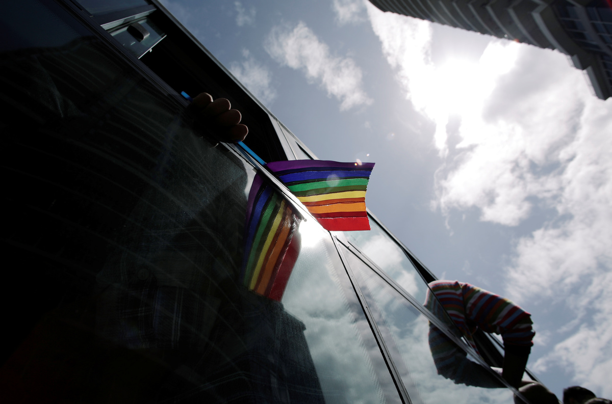 A reveller waves a rainbow flag from a bus during the annual Gay Pride parade along a Central Avenue, in San Jose, Costa Rica June 23, 2019. REUTERS/Juan Carlos Ulate