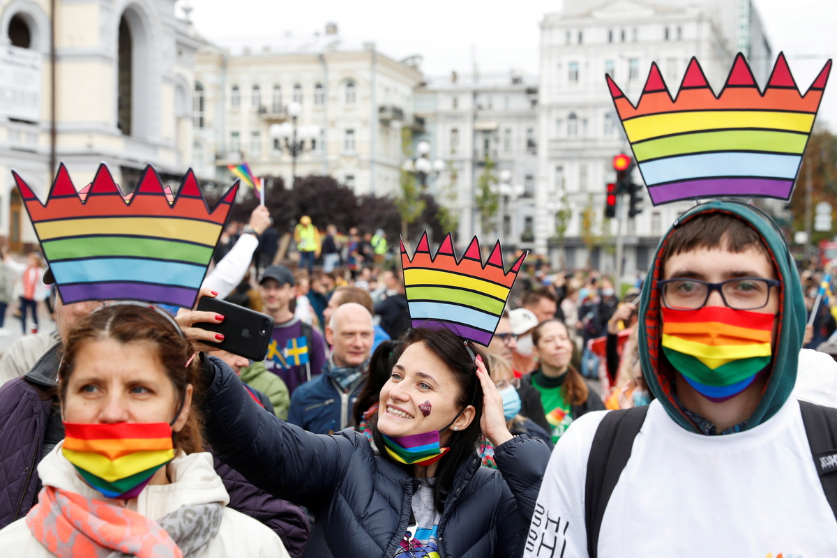 Thousands of people including soldiers and diplomats marched peacefully through the Ukrainian capital on Sunday in an annual gay pride parade despite some opposition to an event called off last year because of the coronavirus pandemic.