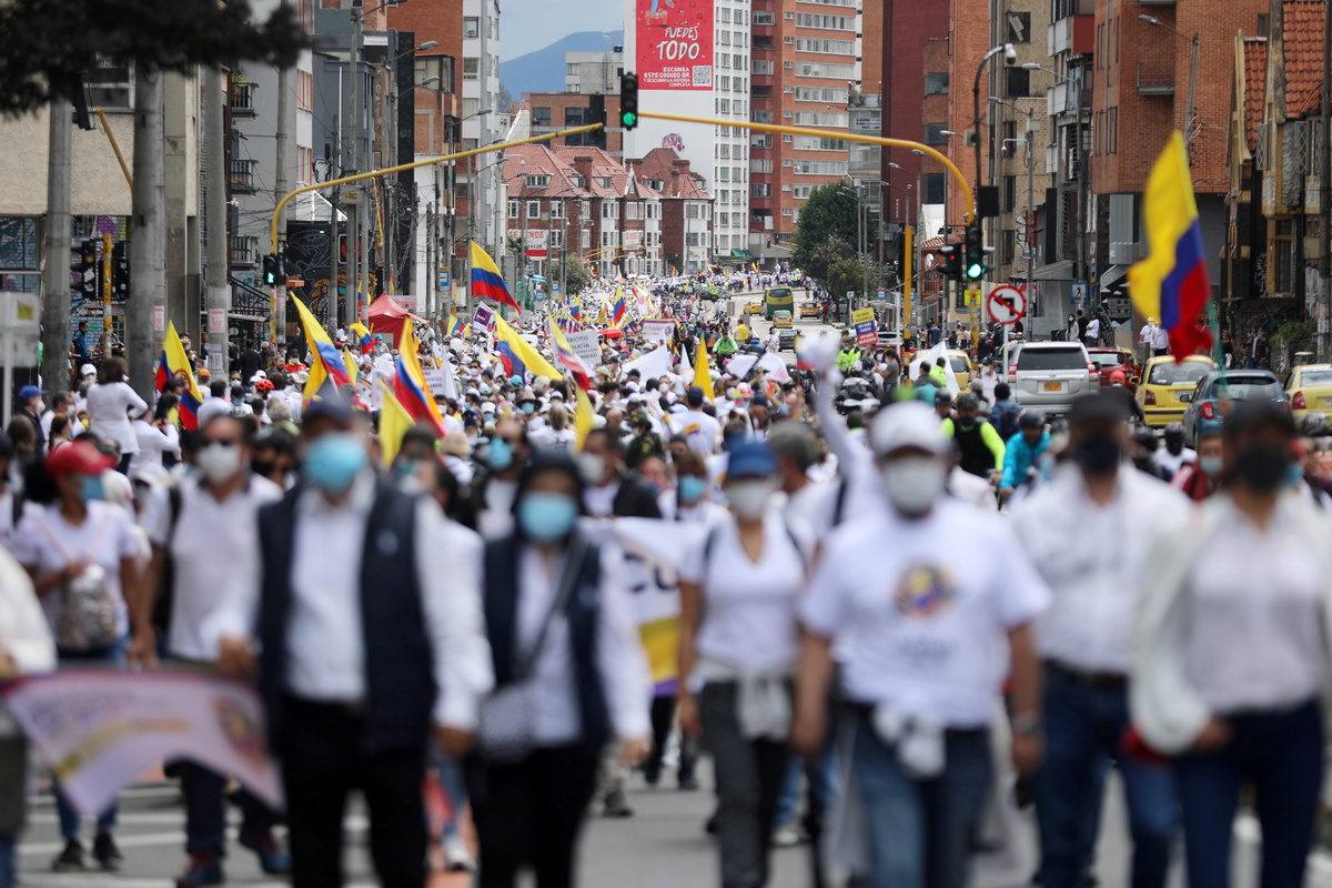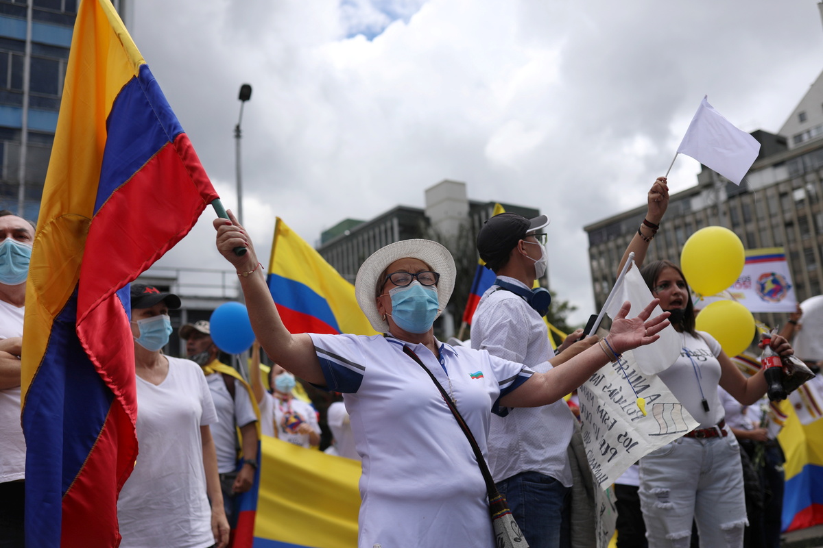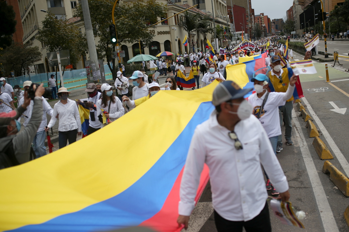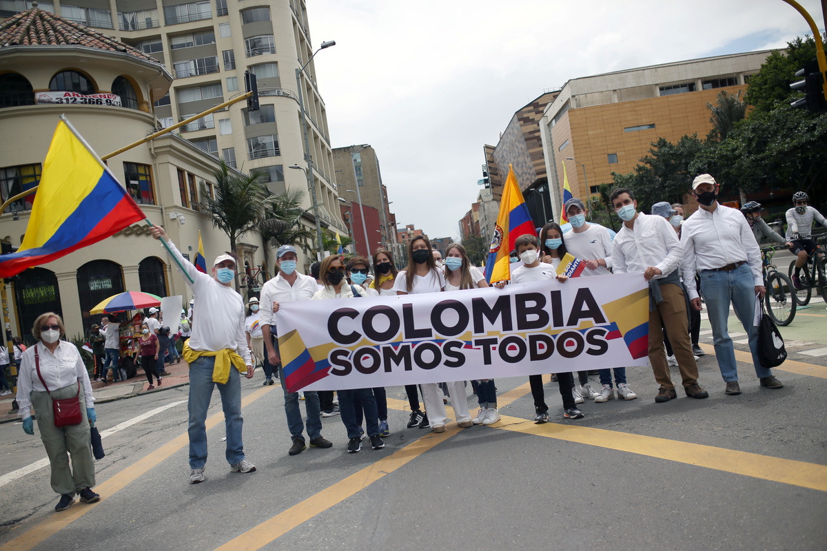Waving flags and dressed in white, thousands marched in Colombia's capital Bogota on Sunday to demand an end to protests and roadblocks, as well as to express support for security forces, following a month of demonstrations.
