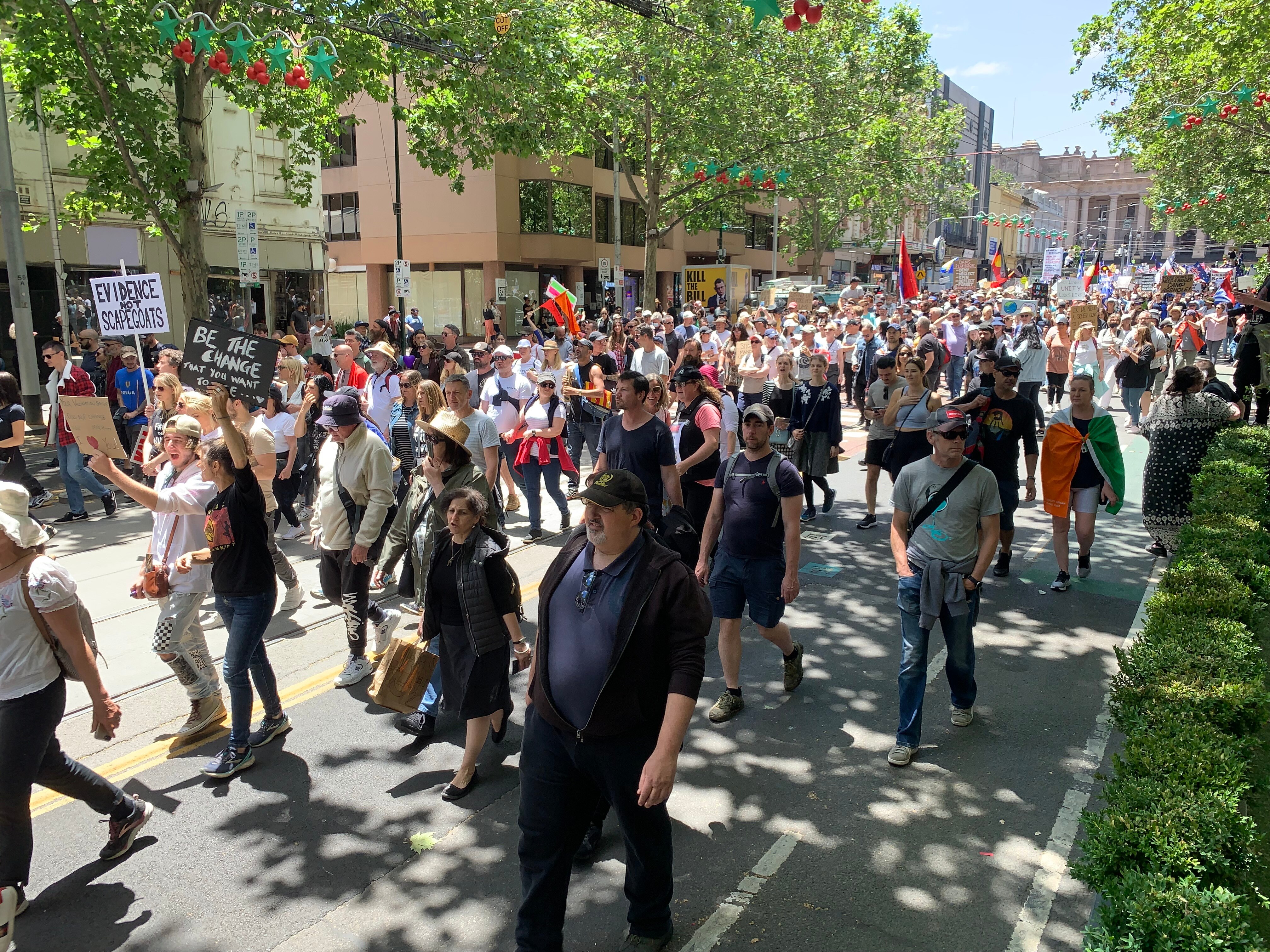 A heavy police presence was monitoring the demonstrators as they walked through Bourke Street Mall amid chants, whistles and drums.