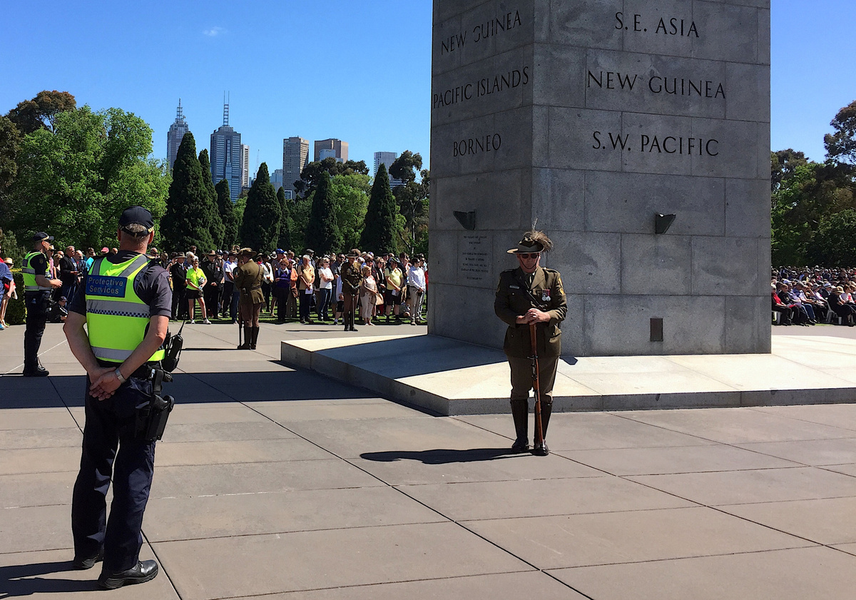 Attendance at Melbourne's the Shrine of Remembrance was bigger than expected, with visitors determined to show they were not bowed by Friday's stabbing of three civilians, one fatal, by Islamic State sympathiser Hassan Khalif Shire Ali, 30.