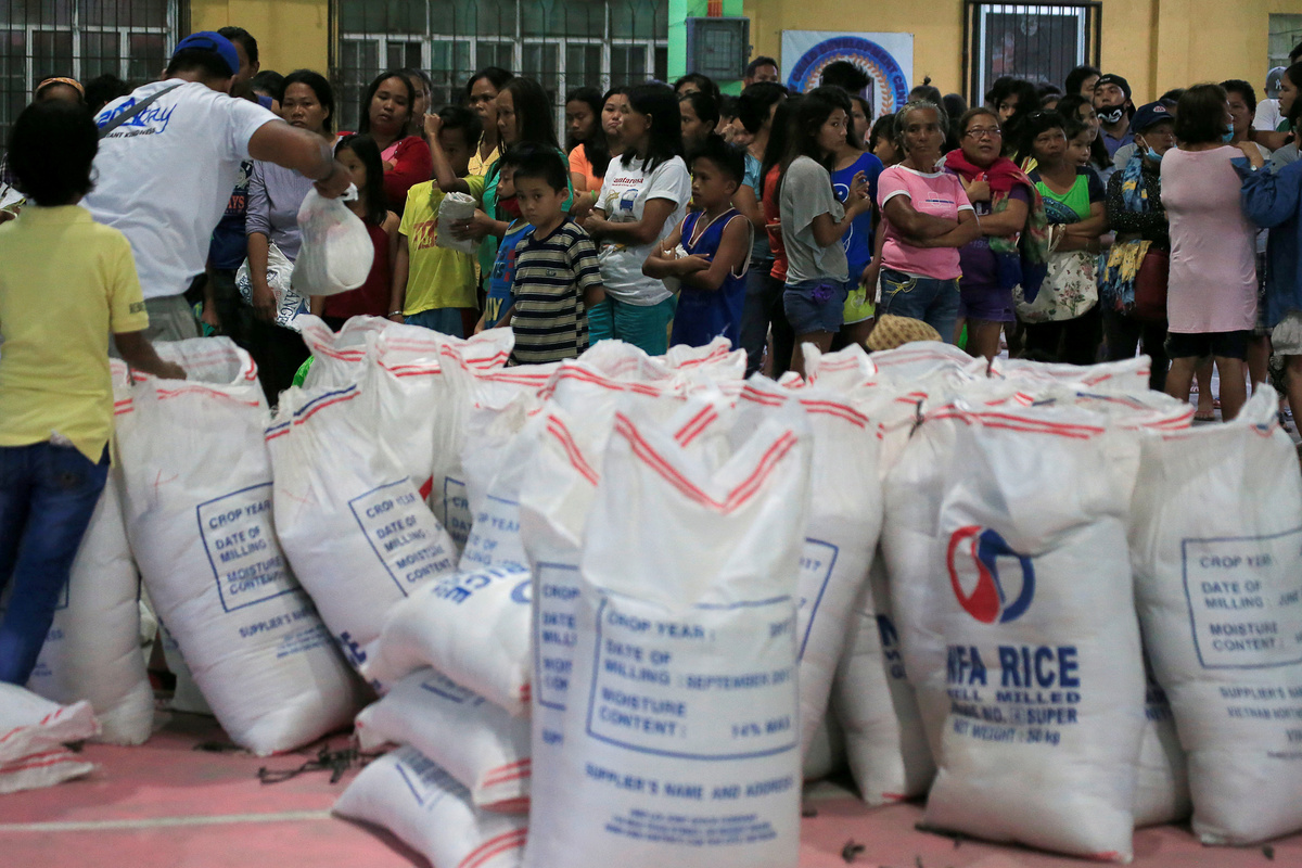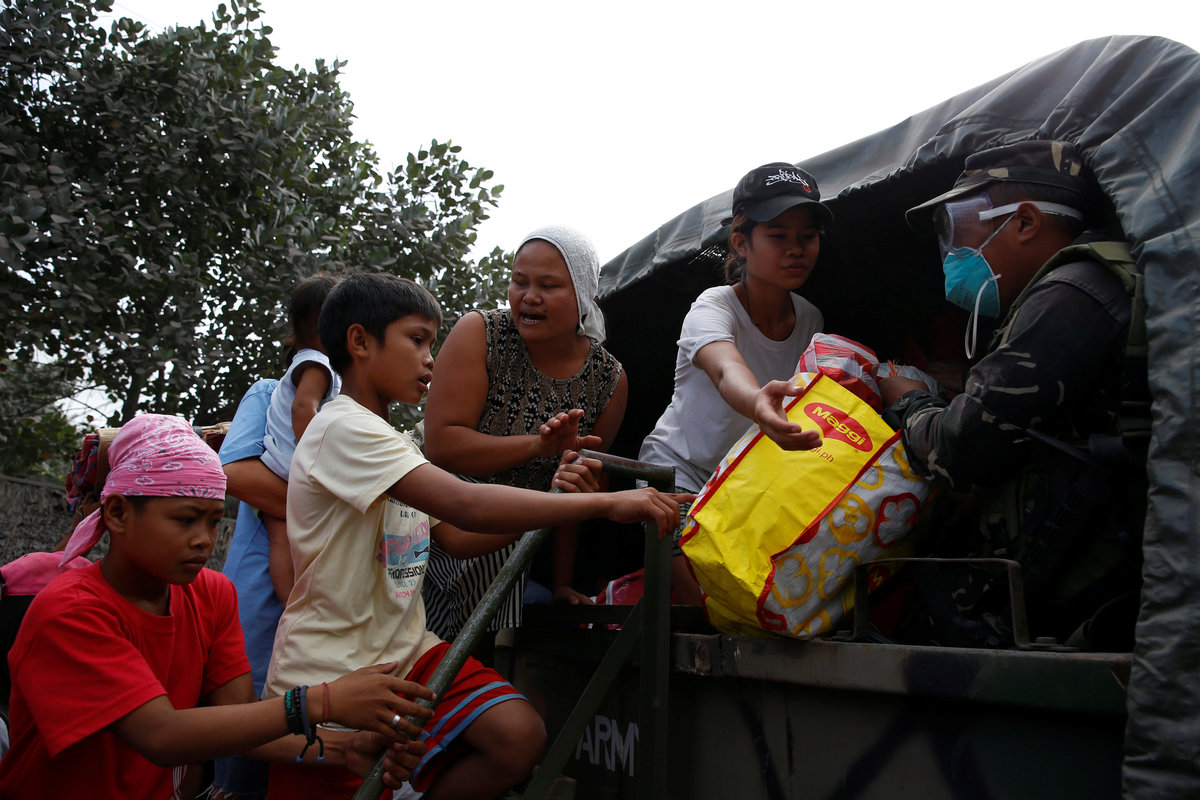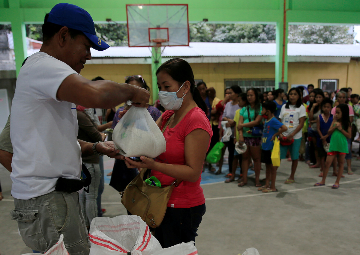 A resident staying at a temporary evacuation center receives relief goods after Mayon Volcano erupt anew in Camalig, Albay province, south of Manila, Philippines January 24, 2018. REUTERS/Romeo Ranoco