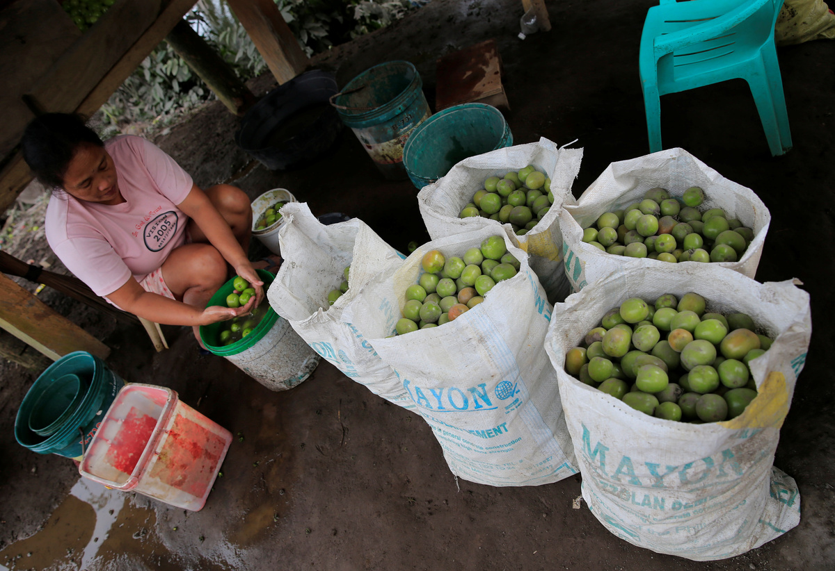 A resident washes tomatoes covered by ash from Mayon Volcano after an eruption at Guinobatan, Albay province, south of Manila, Philippines January 24, 2018. REUTERS/Romeo Ranoco