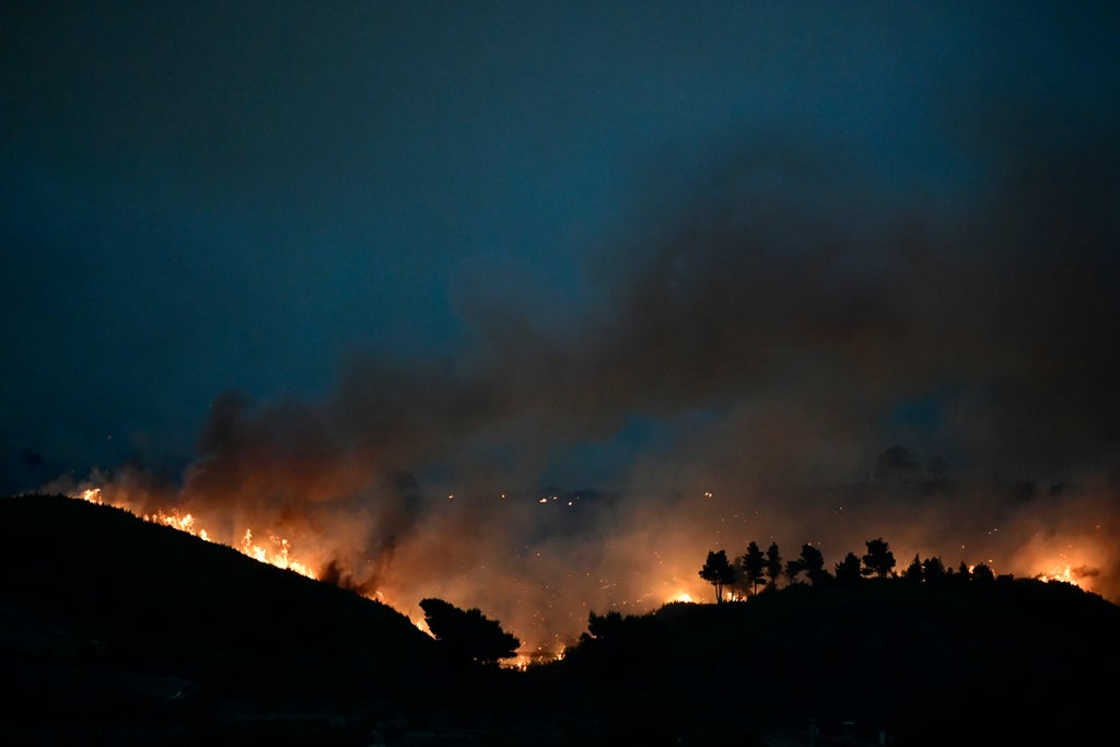 Traffic was halted on the country's main highway connecting Athens to northern Greece, as crews tried to use the road as a barrier to stop the flames advancing before water-dropping planes could resume at first light. But sparks and burning pine cones carried the fire across the highway at several points.