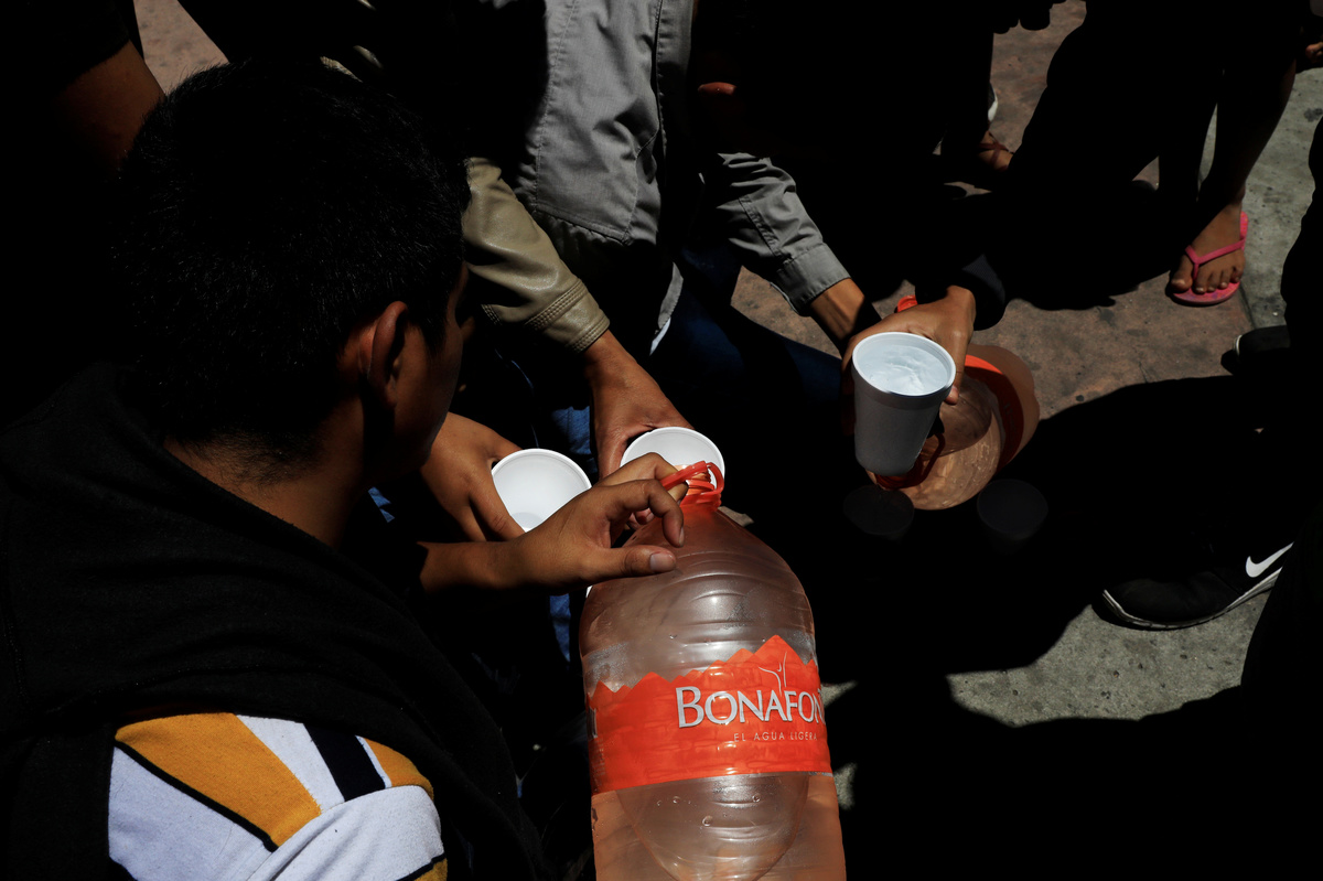 FILE PHOTO: Central American migrants returned from the U.S. to Mexico under the Migrant Protection Protocols (MPP), drink water in Tijuana, Mexico, July 18, 2019. REUTERS/Carlos Jasso