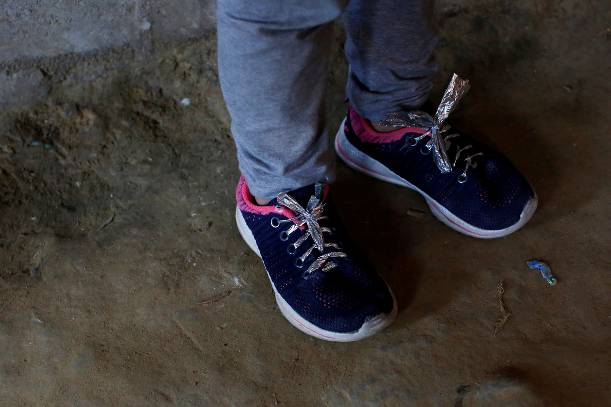 FILE PHOTO: Shoelaces made from a space blanket distributed by the U.S. Customs and Border Protection (CBP), are tied to a shoe of a child migrant in Tijuana, Mexico, July 22, 2019. REUTERS/Carlos Jasso