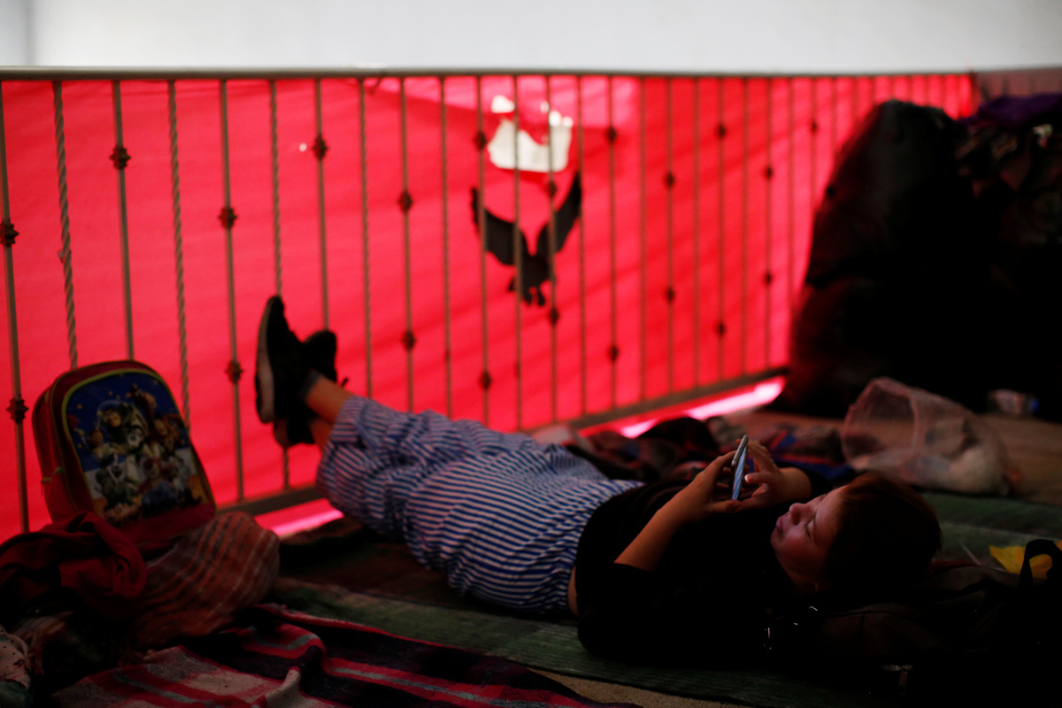 FILE PHOTO: Migrants use their mobile phones inside a shelter in Tijuana, Mexico, July 22, 2019. REUTERS/Carlos Jasso