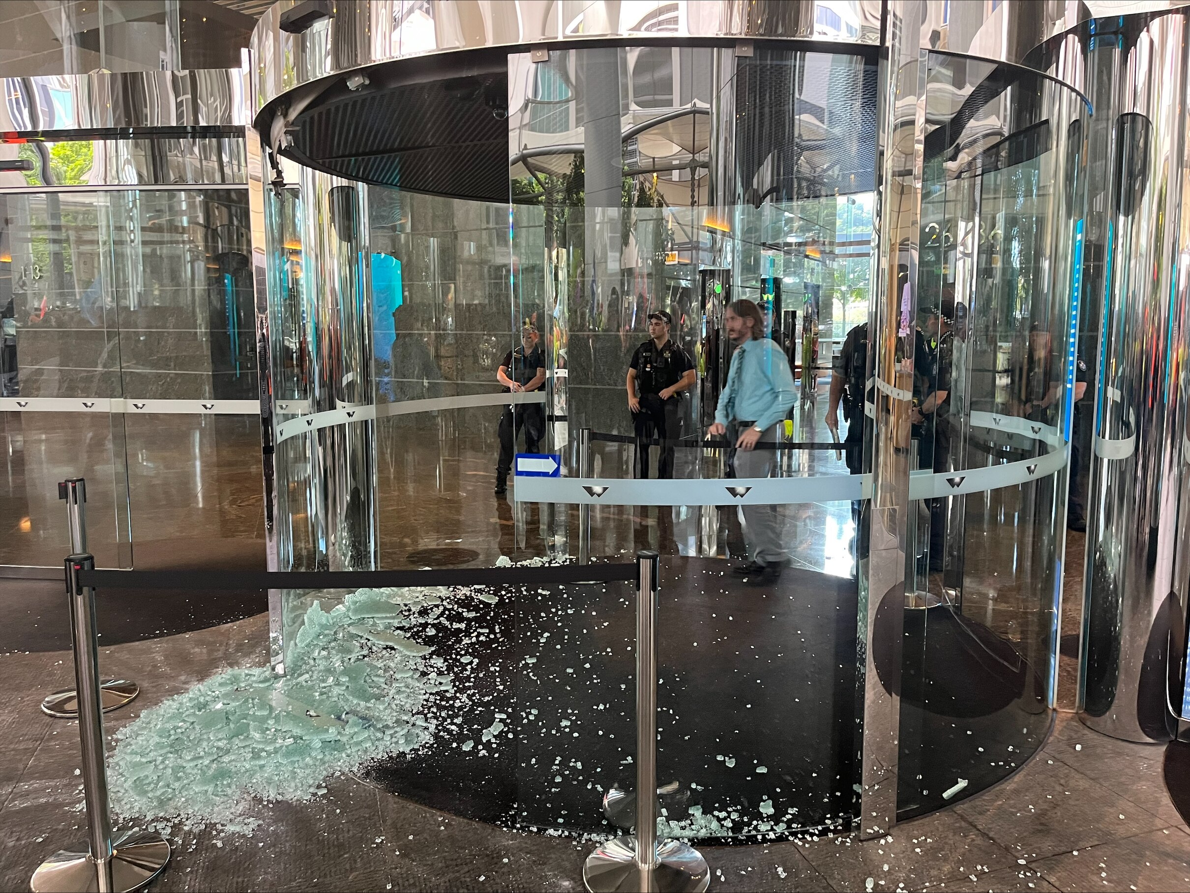 When protesters reached the Waterfront Place offices on Felix Street, they began drumming on glass panels.