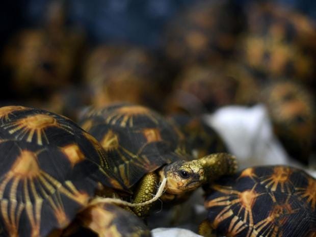 Known for the distinct black and yellow star-like pattern on their shells, radiated tortoises are sought after by collectors around the world.