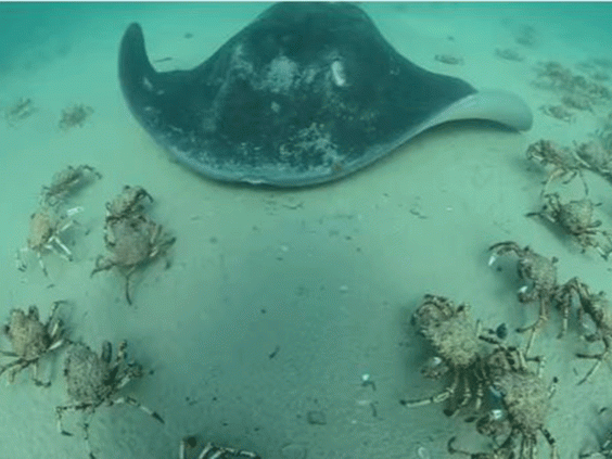 The video shows many of the creatures on the edge of the gathering scuttling away from a huge sting ray which passes through.