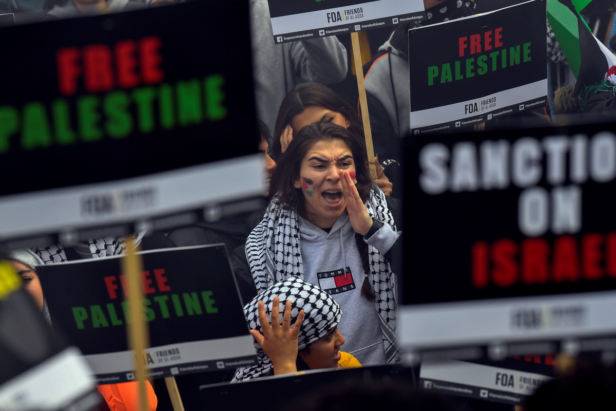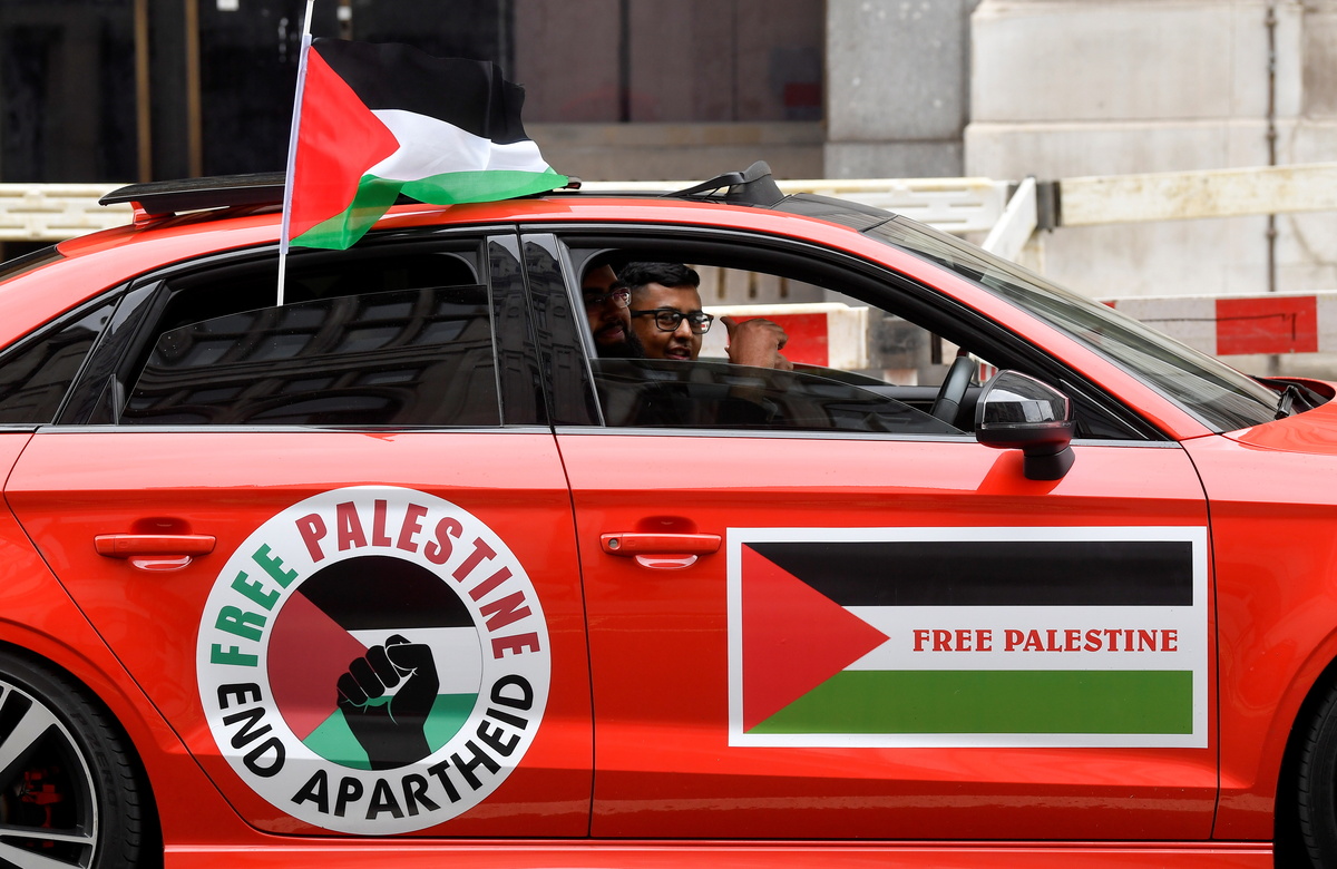 Protesters called for sanctions on Israel during the march in London. Some were draped in Palestinian flags and set off green and red smoke flares. Others carried banners declaring "Free Palestine", "Stop bombing Gaza" and "Sanctions on Israel".