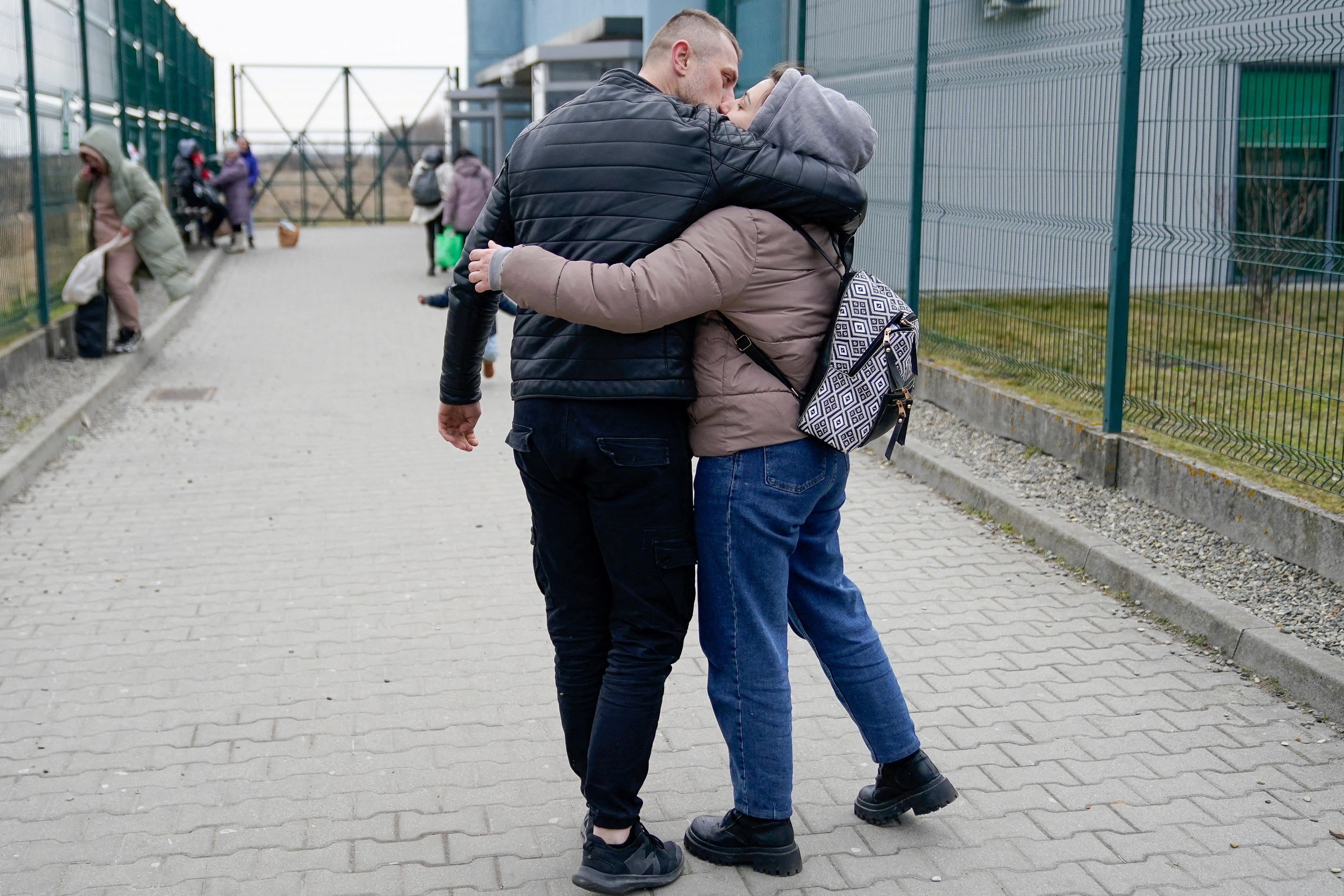 About 85 kilometres from the western Ukraine city of Lviv, at the crossing into Poland, the roads were packed with cars and people hugging loved ones — some saying goodbye.