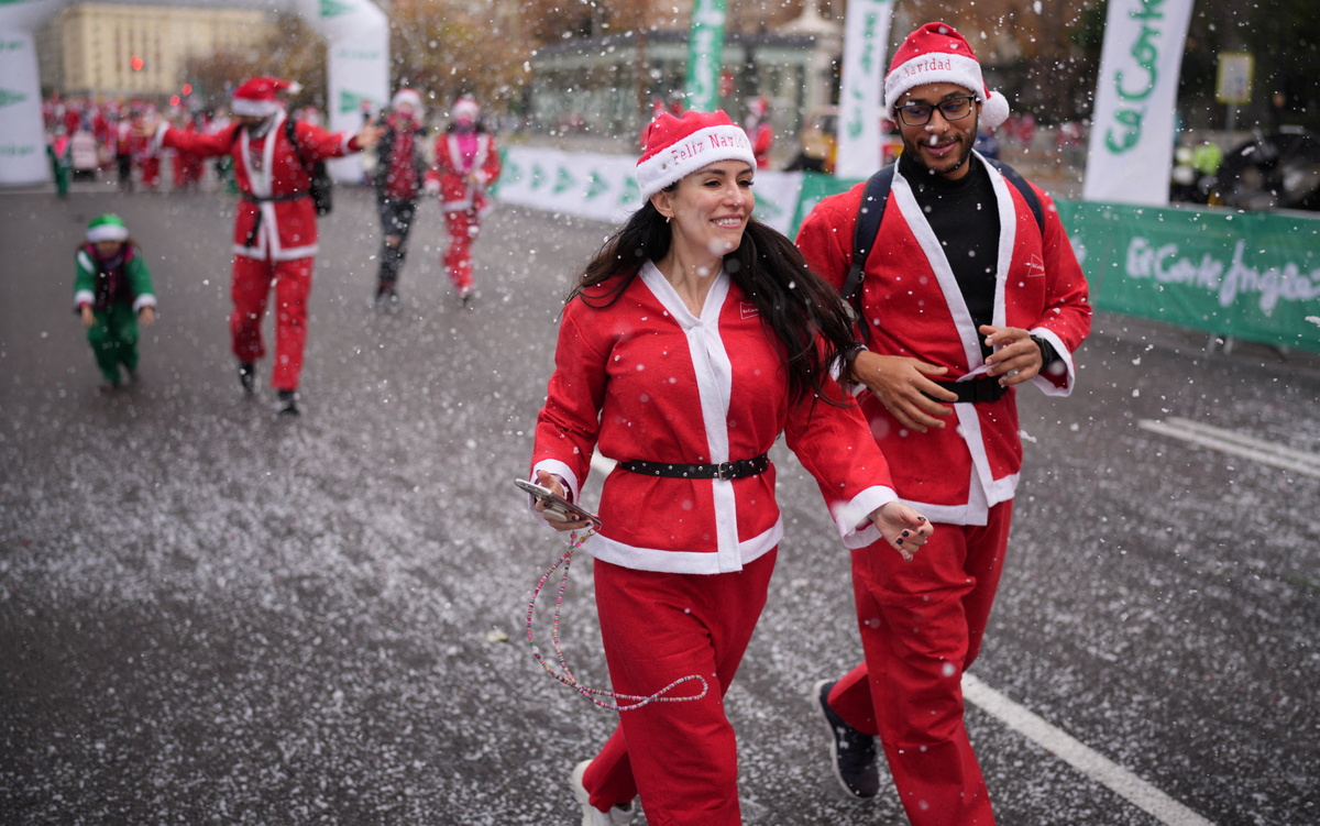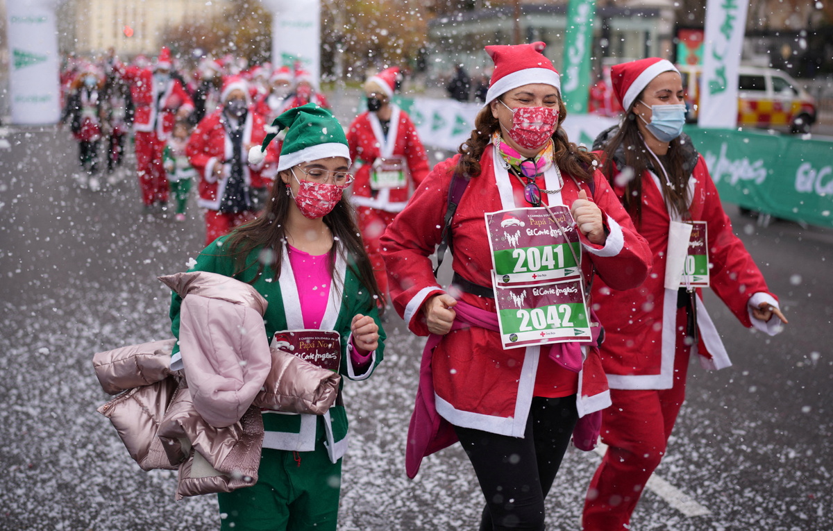 Decked out in classic red and white outfits, the runners set off in a flurry of fake snow along the Paseo de la Castellana, a major boulevard through the city centre.