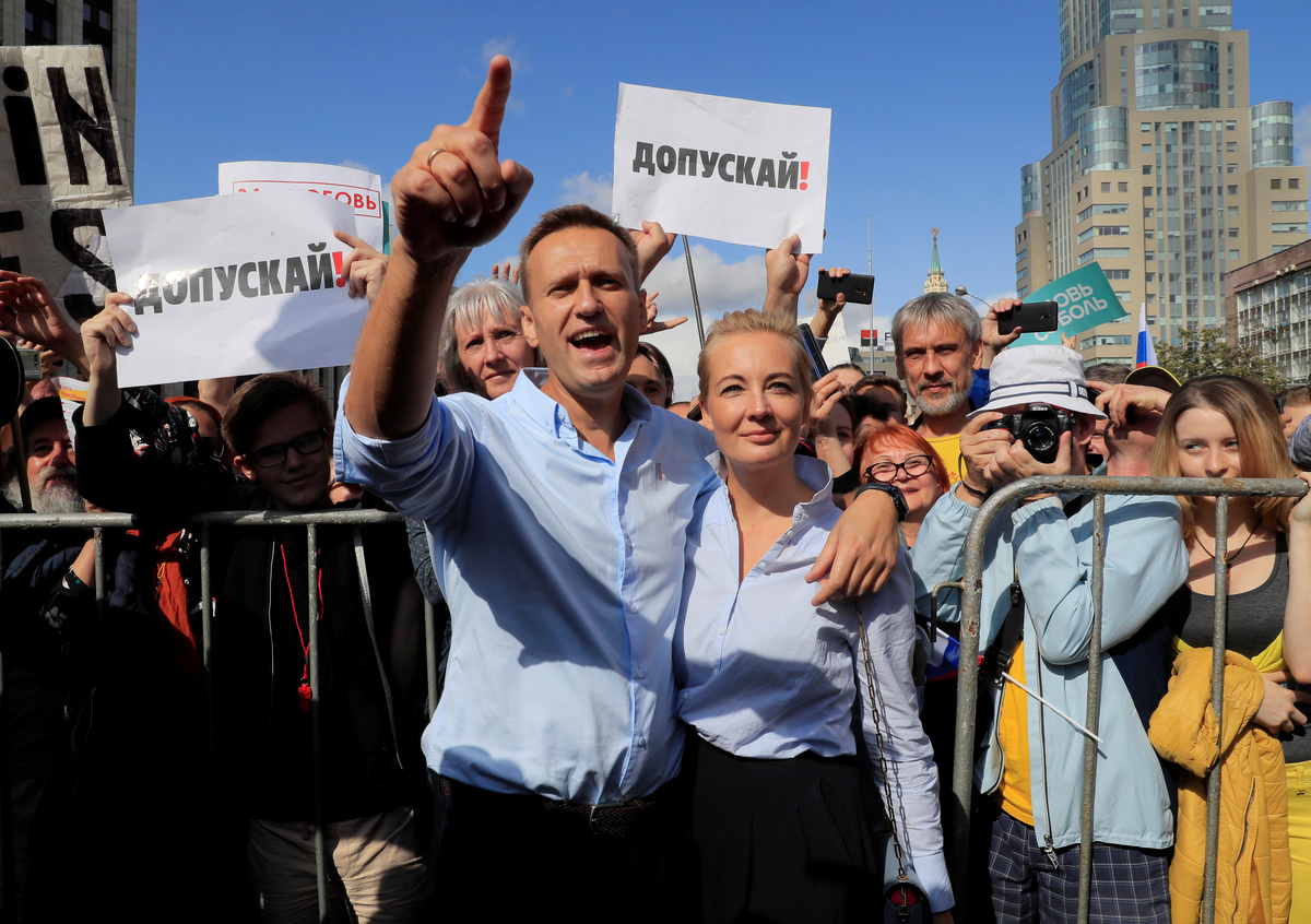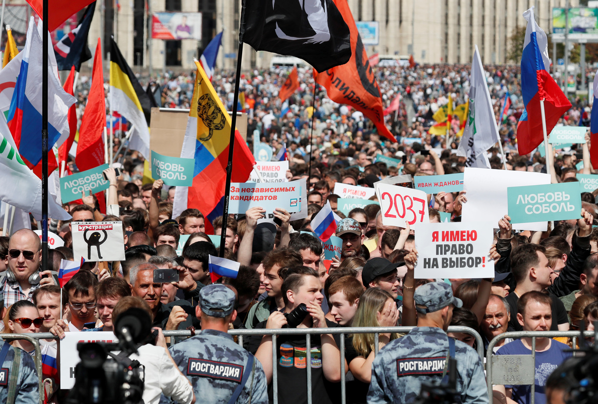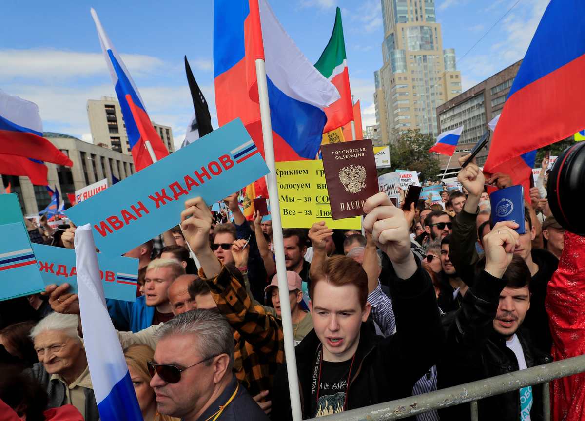 The protesters, led by Alexei Navalny, the most prominent critic of the Kremlin, demanded the authorities allow opposition candidates to run in the Sept. 8 vote.