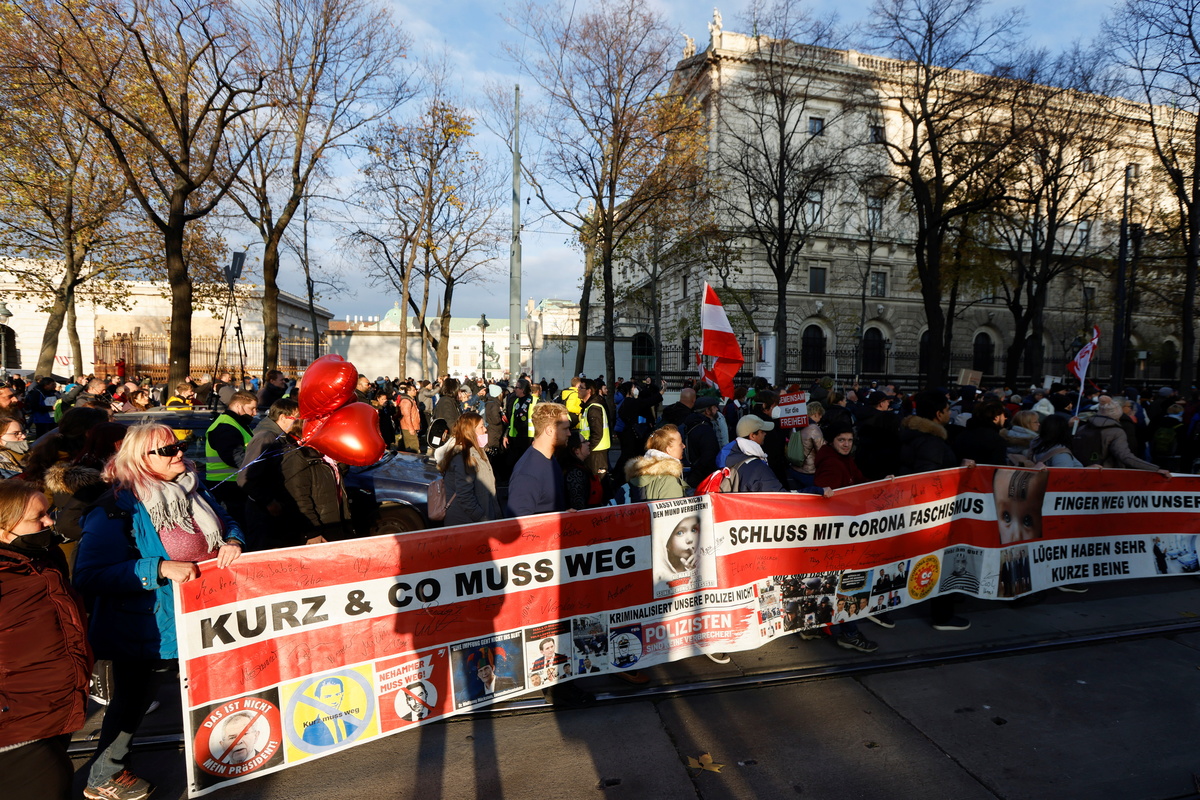 Tens of thousands of people, many of them far-right supporters, protested in Vienna on Saturday against coronavirus restrictions a day after Austria's government announced a new lockdown and said vaccines would be made compulsory next year.